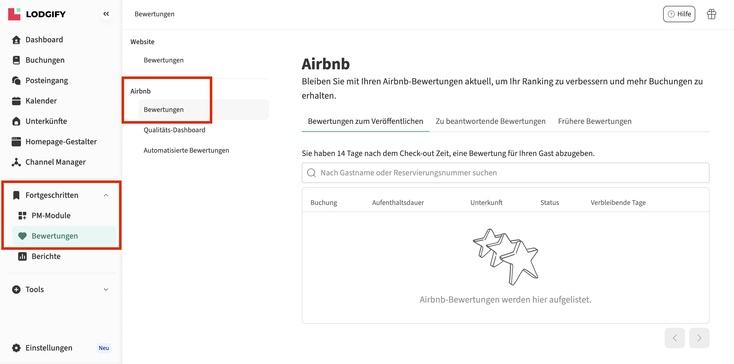 Im Airbnb-Tab des Bewertungen-Menüs können Sie: