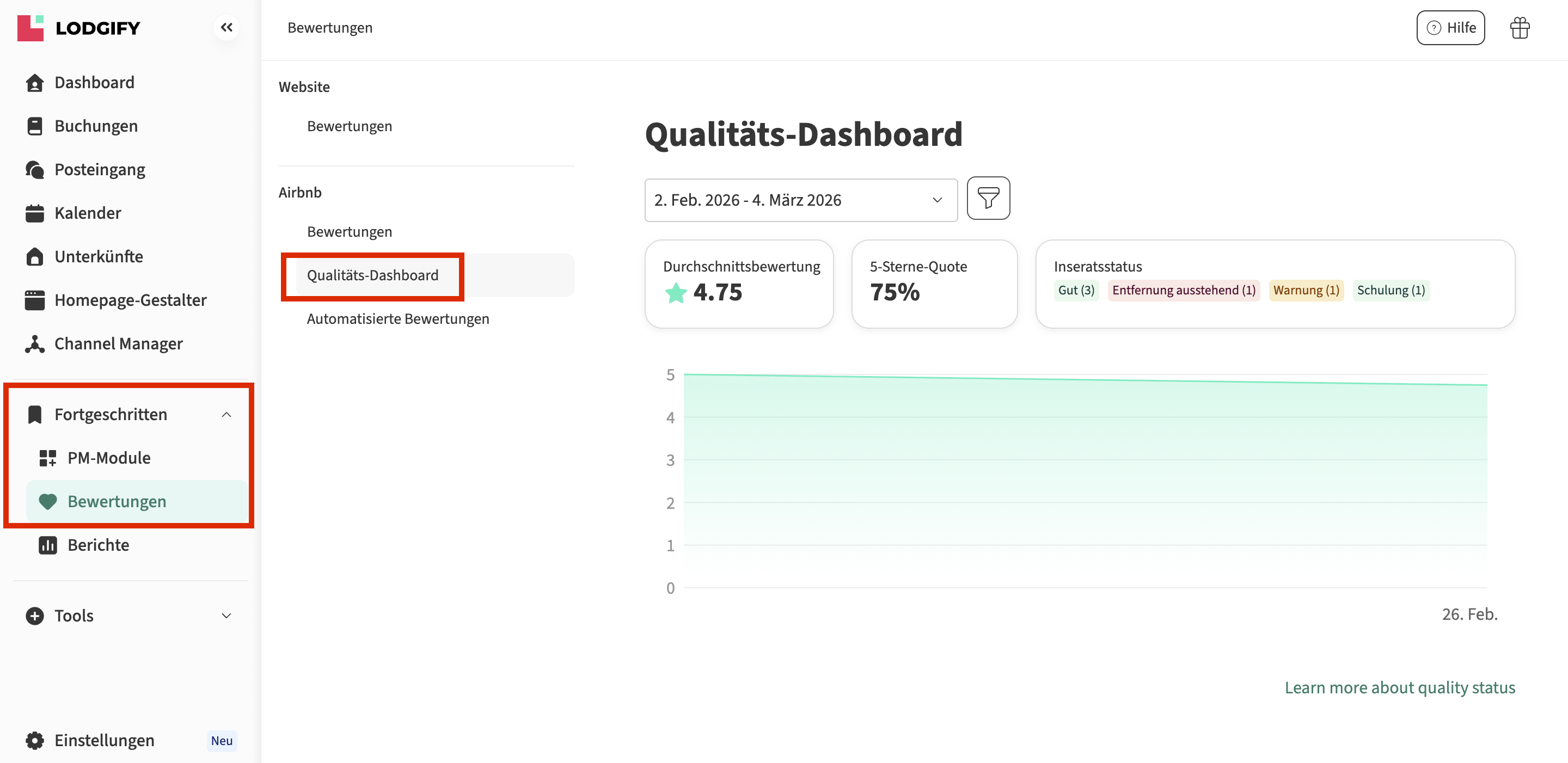Das Qualitäts-Dashboard bietet eine zentrale Übersicht über die Leistung Ihrer Airbnb-Unterkünfte. Es hilft Ihnen, wichtige Qualitätskennzahlen zu verfolgen, leistungsschwache Inserate zu erkennen, Bewertungstrends zu analysieren und die Einhaltung der Airbnb-Qualitätsstandards sicherzustellen.
