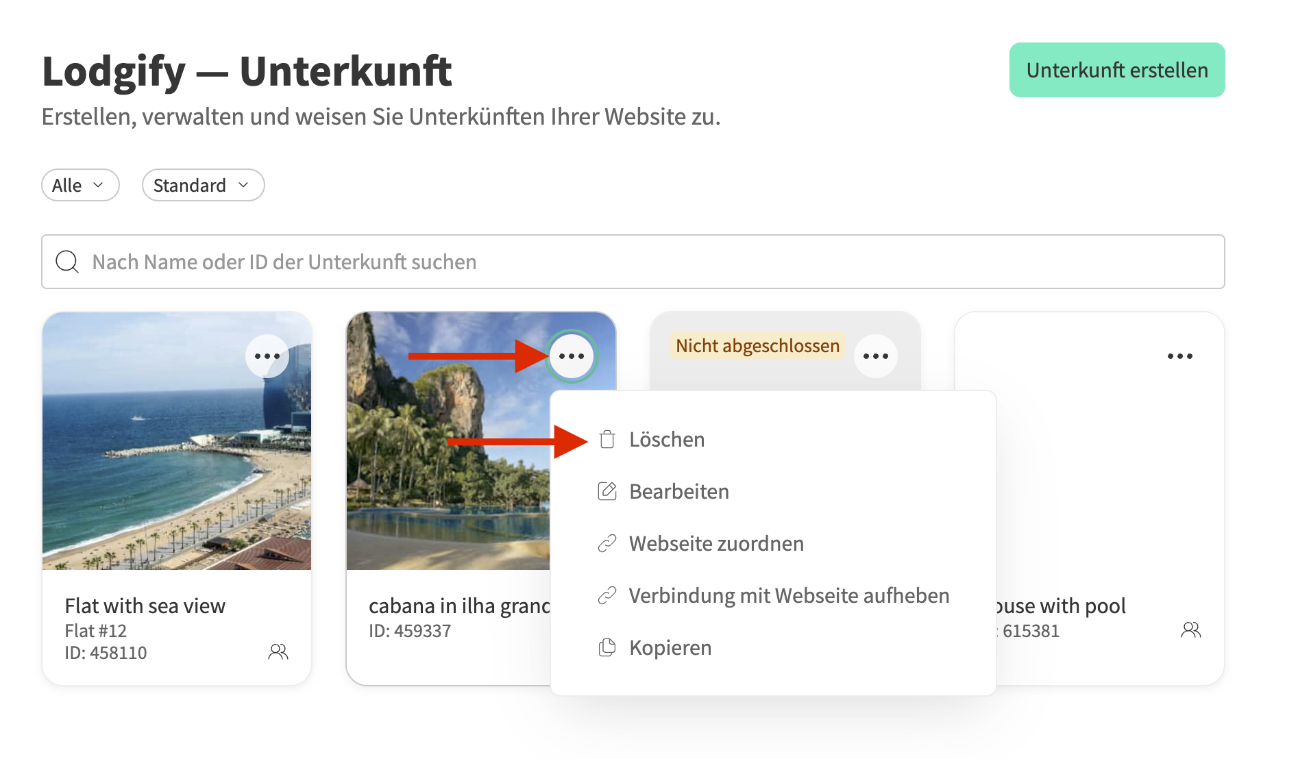 Um eine Unterkunft zu löschen, folgen Sie diesen Schritten: