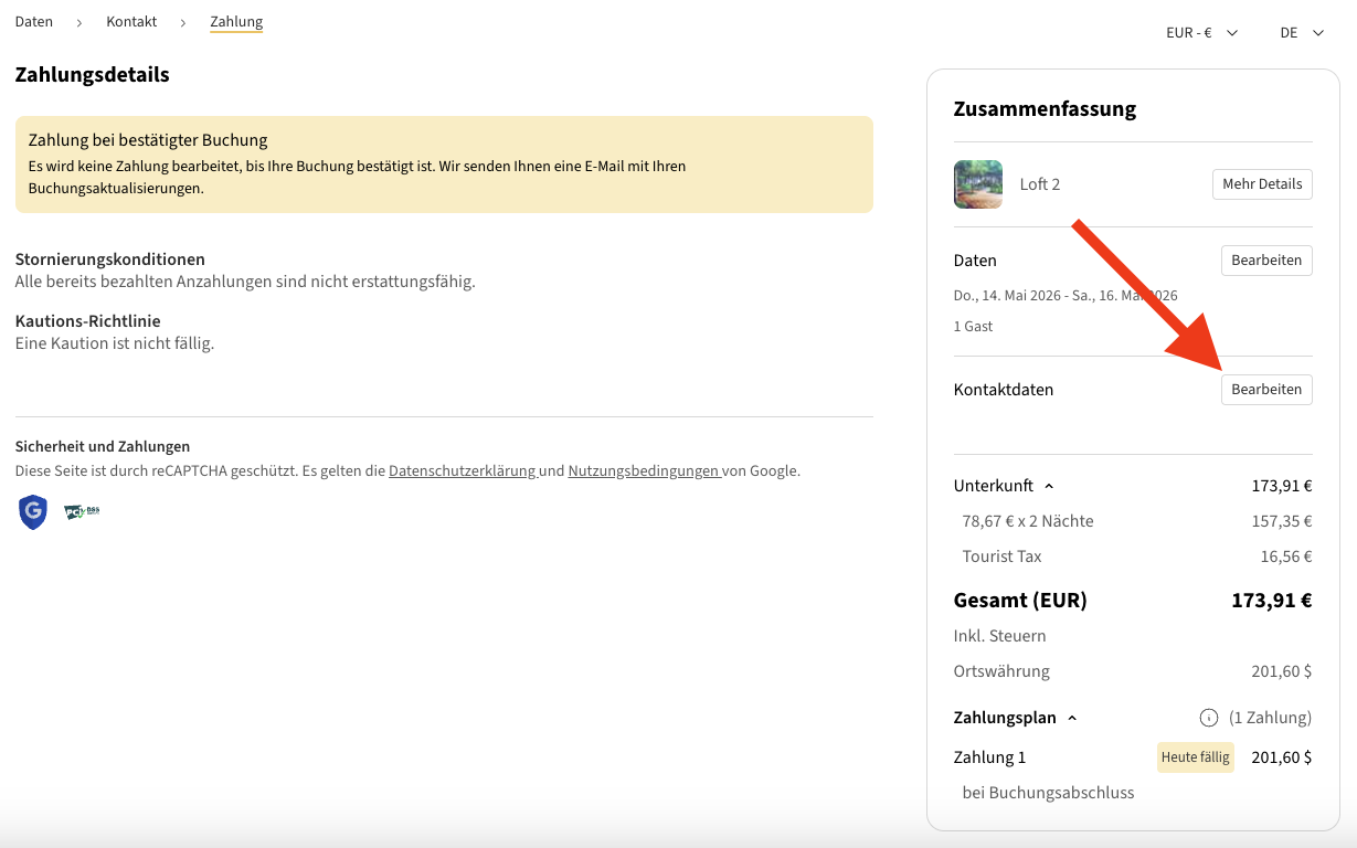In Ihrer Reservierung können Sie die Aufschlüsselung von Erwachsenen, Kindern und Haustieren einsehen. Sie können auch Änderungen an Gästedetails vornehmen, wie zum Beispiel eine Telefonnummer hinzufügen oder die bevorzugte Sprache für die Kommunikation mit einem bestimmten Gast ändern.