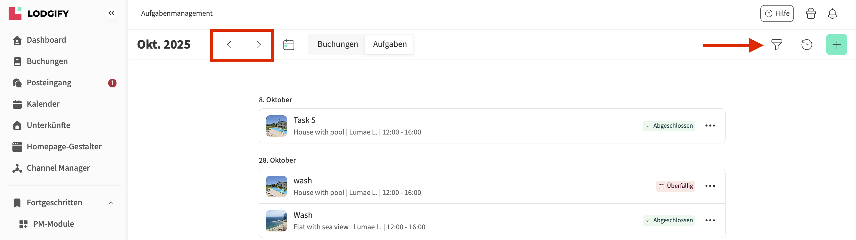 Ihre Aufgaben sind chronologisch nach Monaten sortiert. Sie können den Monat mit den Pfeilen oben links ändern, um Aufgaben aus anderen Monaten als dem aktuellen anzuzeigen. Sie können Ihre Aufgaben auch filtern, indem Sie oben rechts auf das Filter-Symbol klicken.