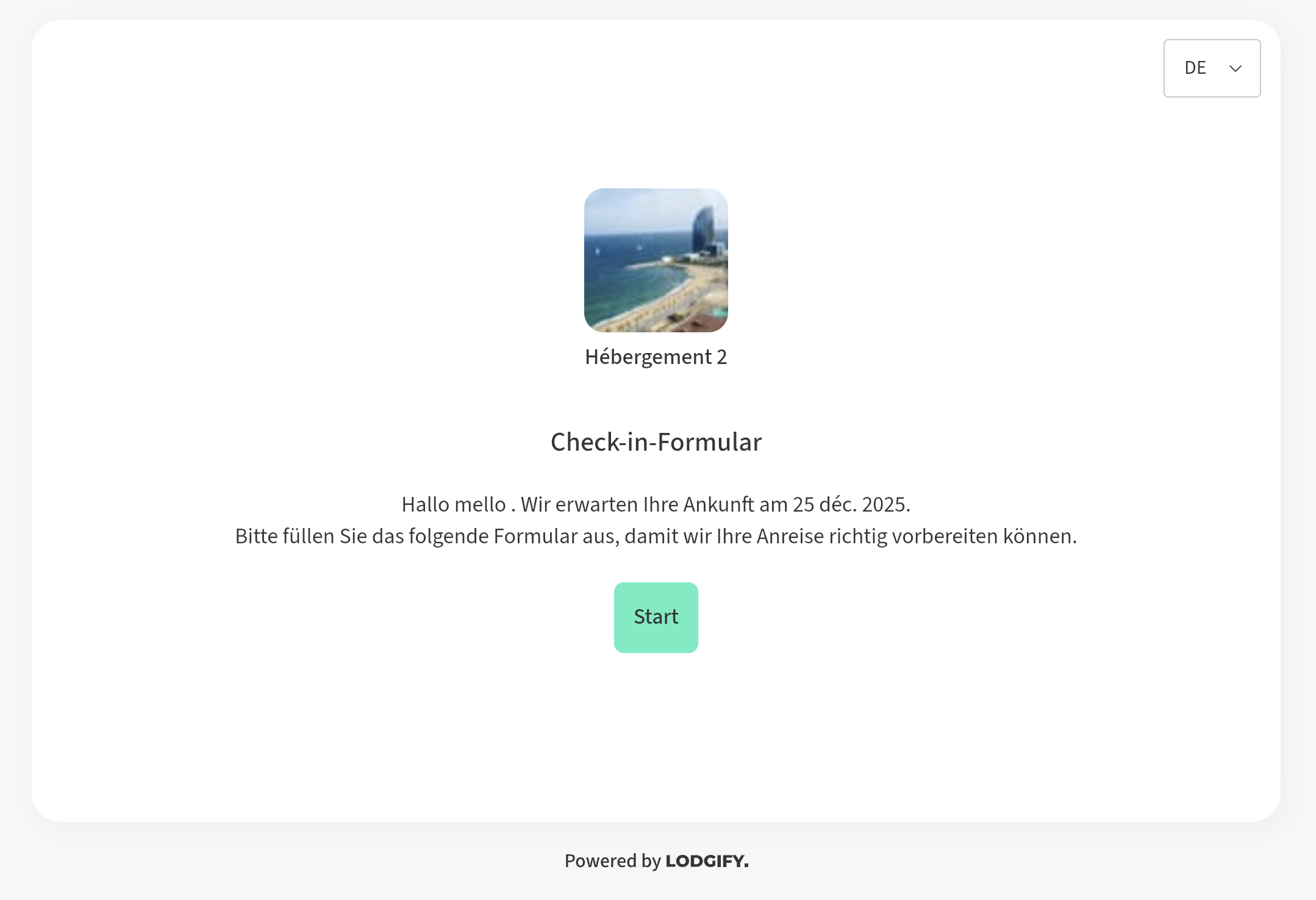 - Wenn der Gast den Link zum Check-in-Formular für Buchungen öffnet, sieht er die Seite, auf der er das Formular ausfüllen kann: