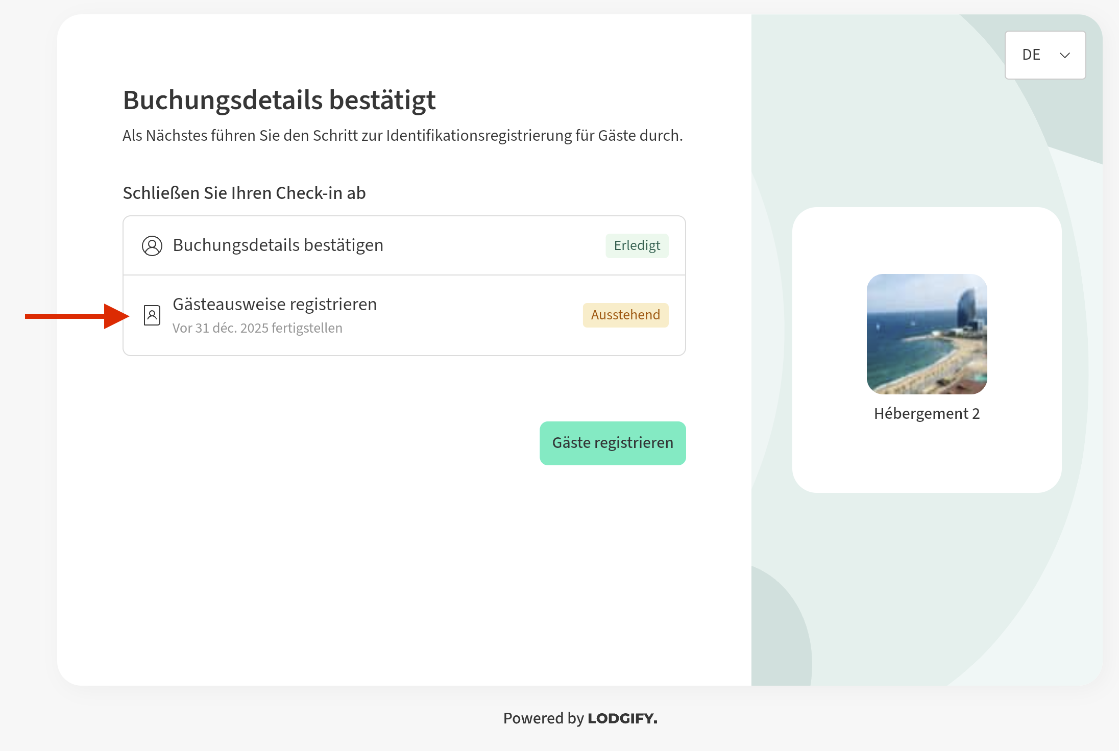 - Nachdem der Gast die Informationen im Check-in-Formular für Buchungen ausgefüllt hat, wird er – sofern das digitale Gästeregistrierungsformular aktiviert ist – automatisch dazu eingeladen, dieses ebenfalls auszufüllen: