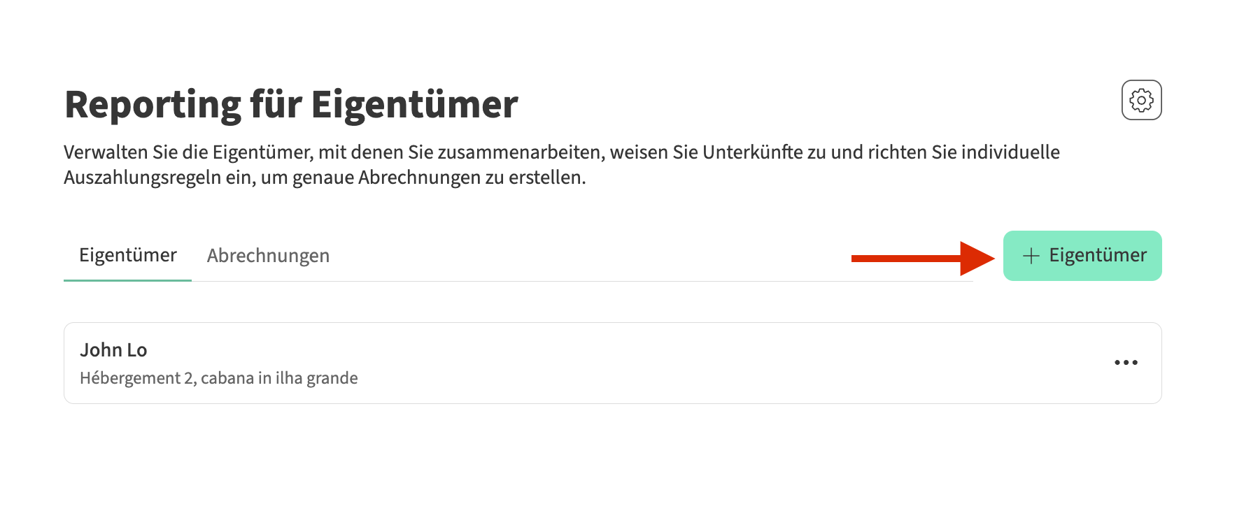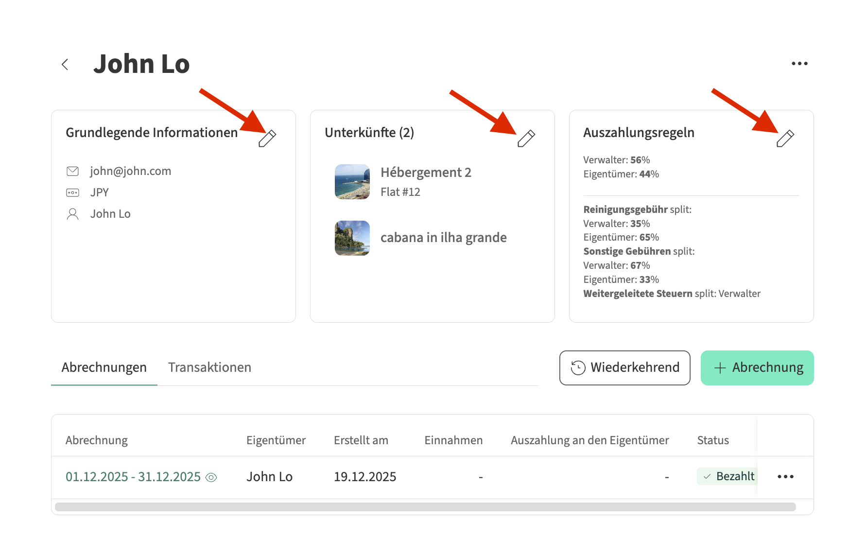 Um die Profilinformationen, die zugeordneten Unterkünfte oder die Auszahlungsregeln eines Eigentümers zu bearbeiten, folgen Sie diesen Schritten: