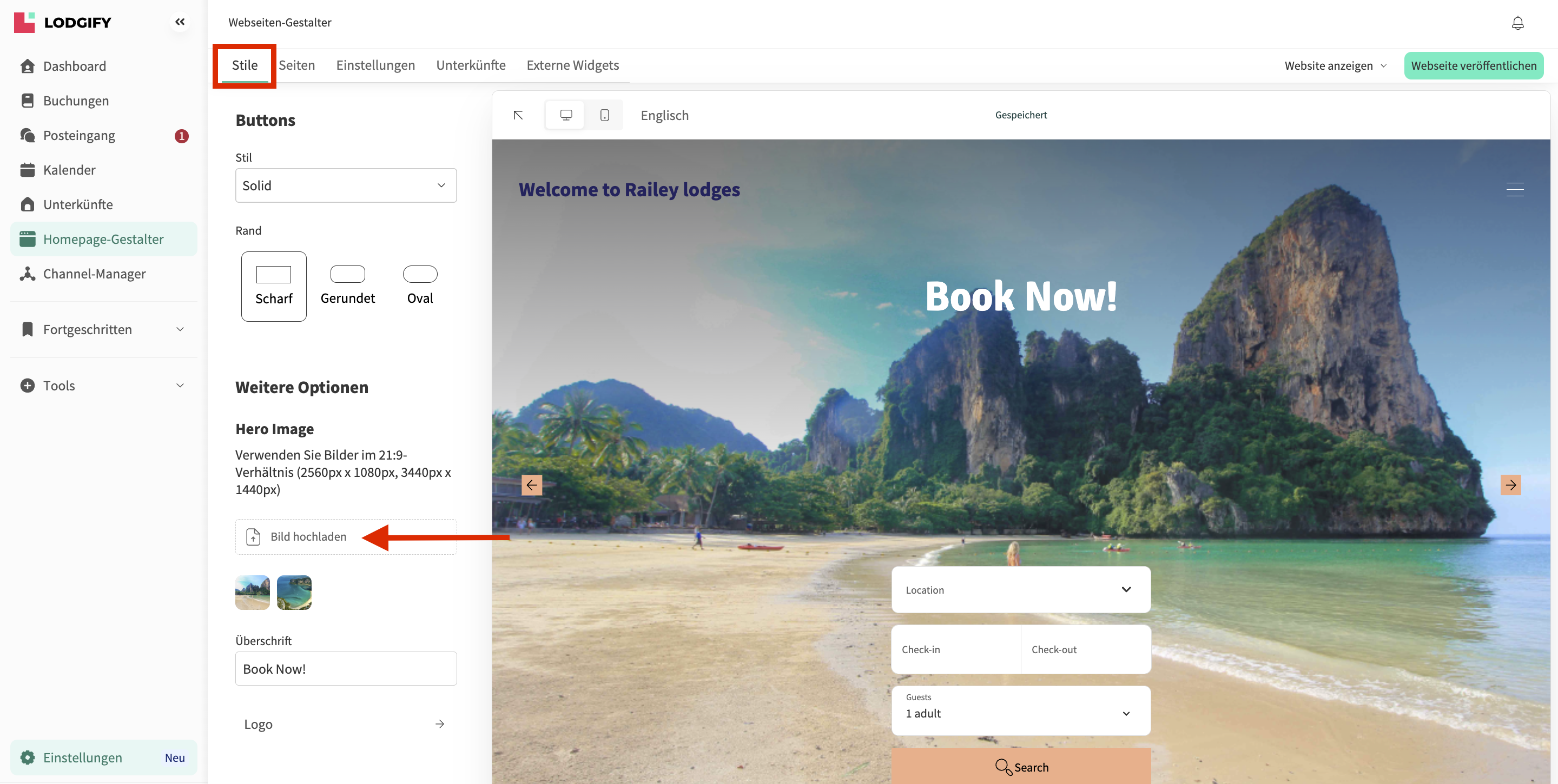 - Hochladen eines Hero-Bildes oder eine Hero-Slideshow auf Ihrer Startseite