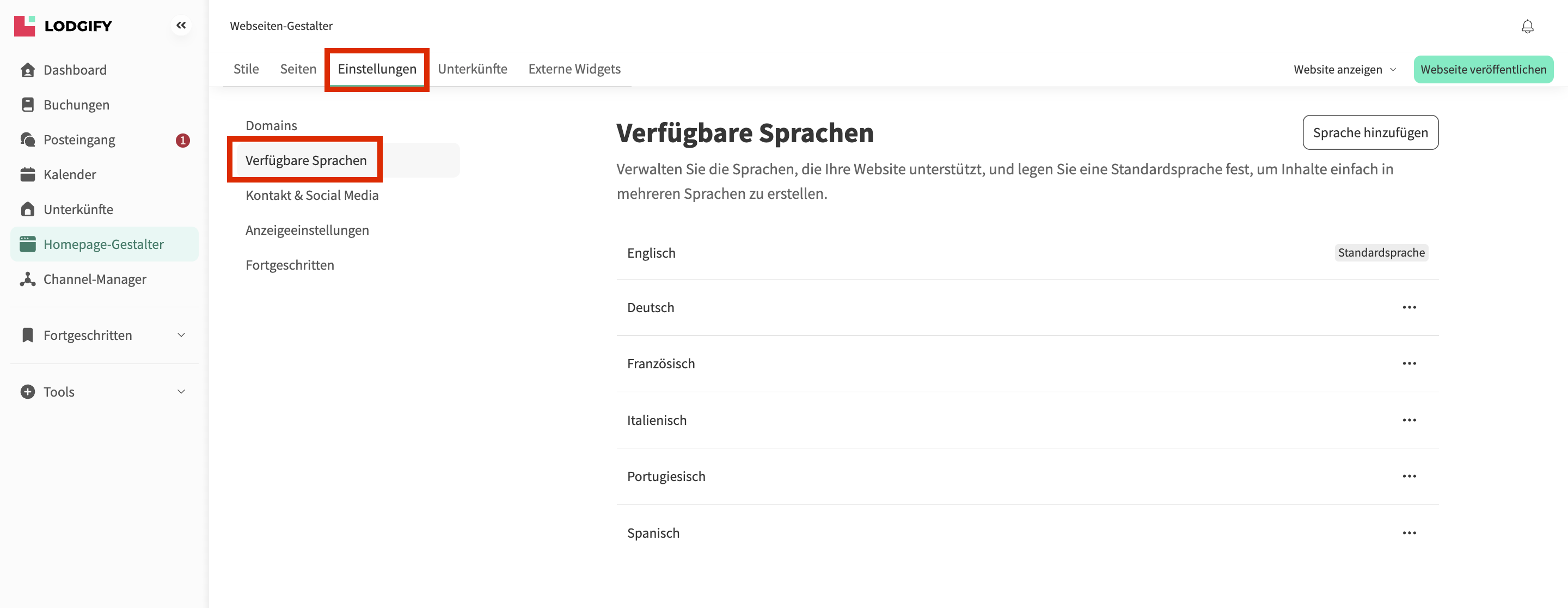 Um die derzeit aktiven Sprachen auf Ihrer Webseite zu sehen, navigieren Sie zum Homepage-Gestalter-Tab und greifen Sie auf den Bereich Einstellungen und Verfügbare Sprachen zu. - Sie können Ihre Fotos jetzt per Drag & Drop neu anordnen. Um ein Foto zu löschen, klicken Sie auf das Papierkorb-Symbol in der oberen rechten Ecke des Bildes