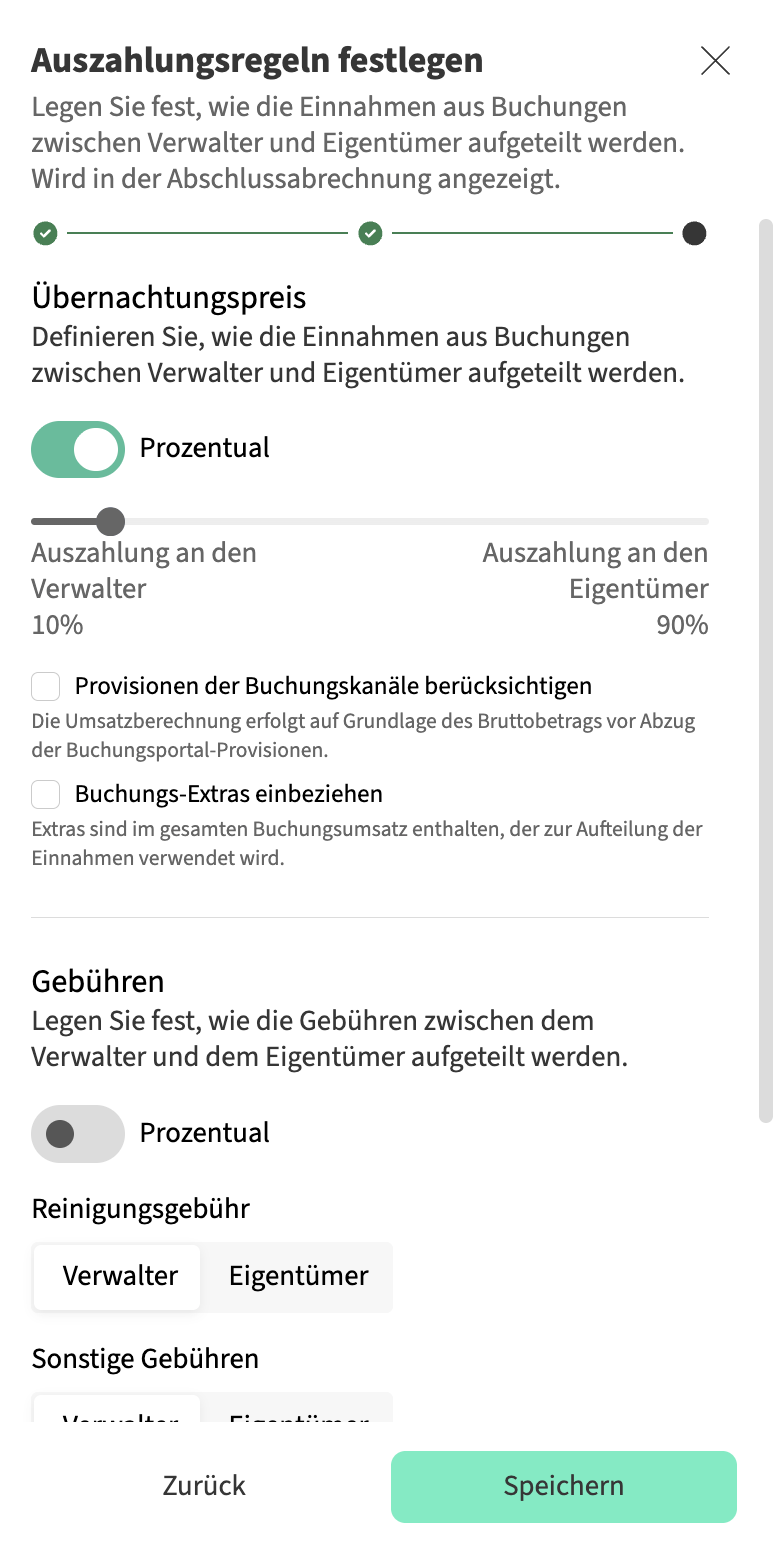 Gebühren: Wenn die gesamten Gebühren an den Eigentümer gehen, wählen Sie einfach den Eigentümer aus und lassen Sie den Schalter aus. Wenn Sie die Gebühren aufteilen möchten, schalten Sie den Prozentsatz-Schalter ein und legen Sie die Auszahlungen für den Verwalter und den Eigentümer fest. Sie können unterschiedliche Einstellungen für Reinigungsgebühren und andere Gebühren anwenden.
