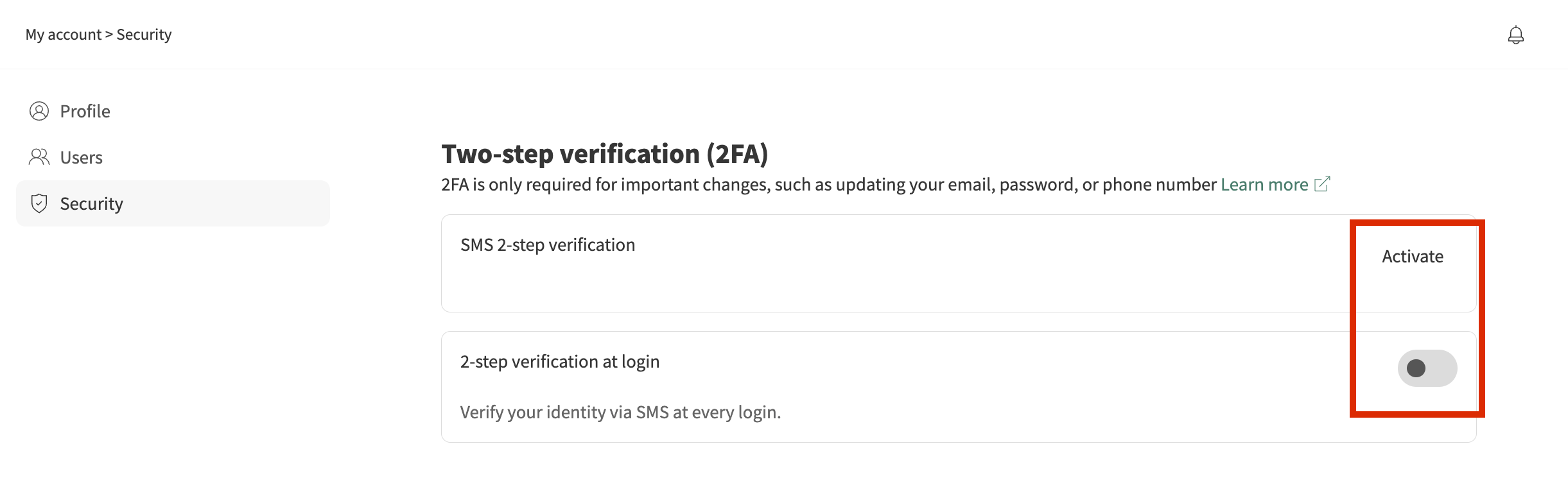 - Once enabled, the SMS 2-step verification cannot be deactivated (the 2-step verification at login can be deactivated)