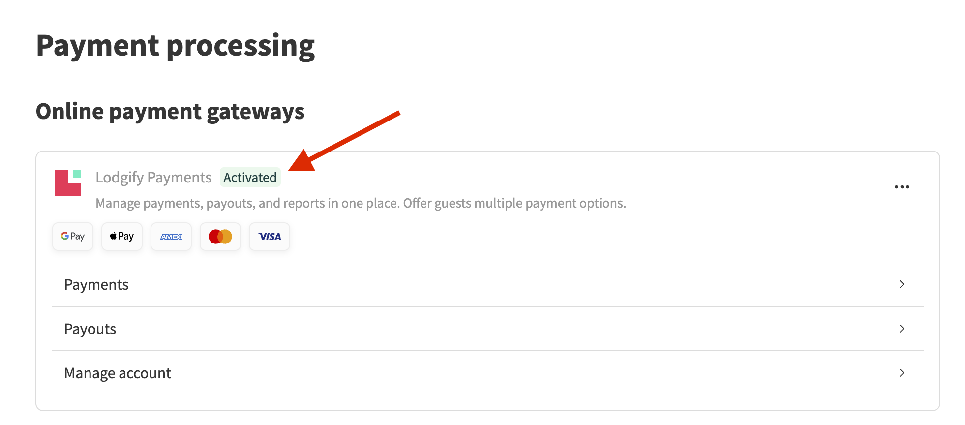 Lodgify Payments can be reactivated at any time. Simply go to the Payments section and select Activate (either directly or by clicking the three dots on the right). All your previously entered information is saved, so you won’t need to enter it again.