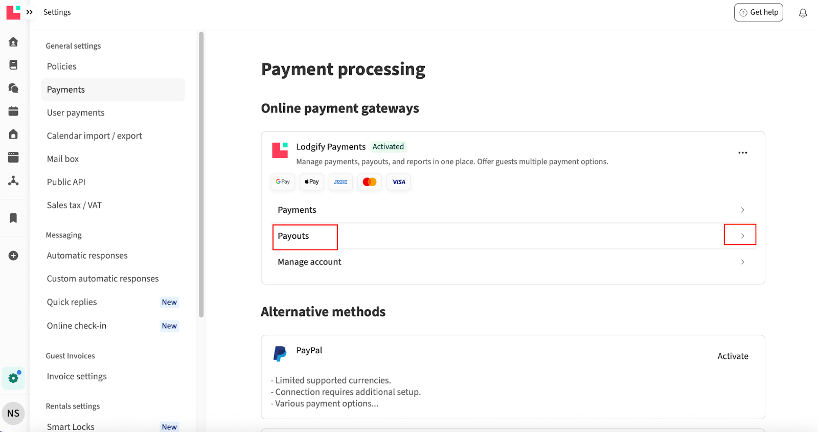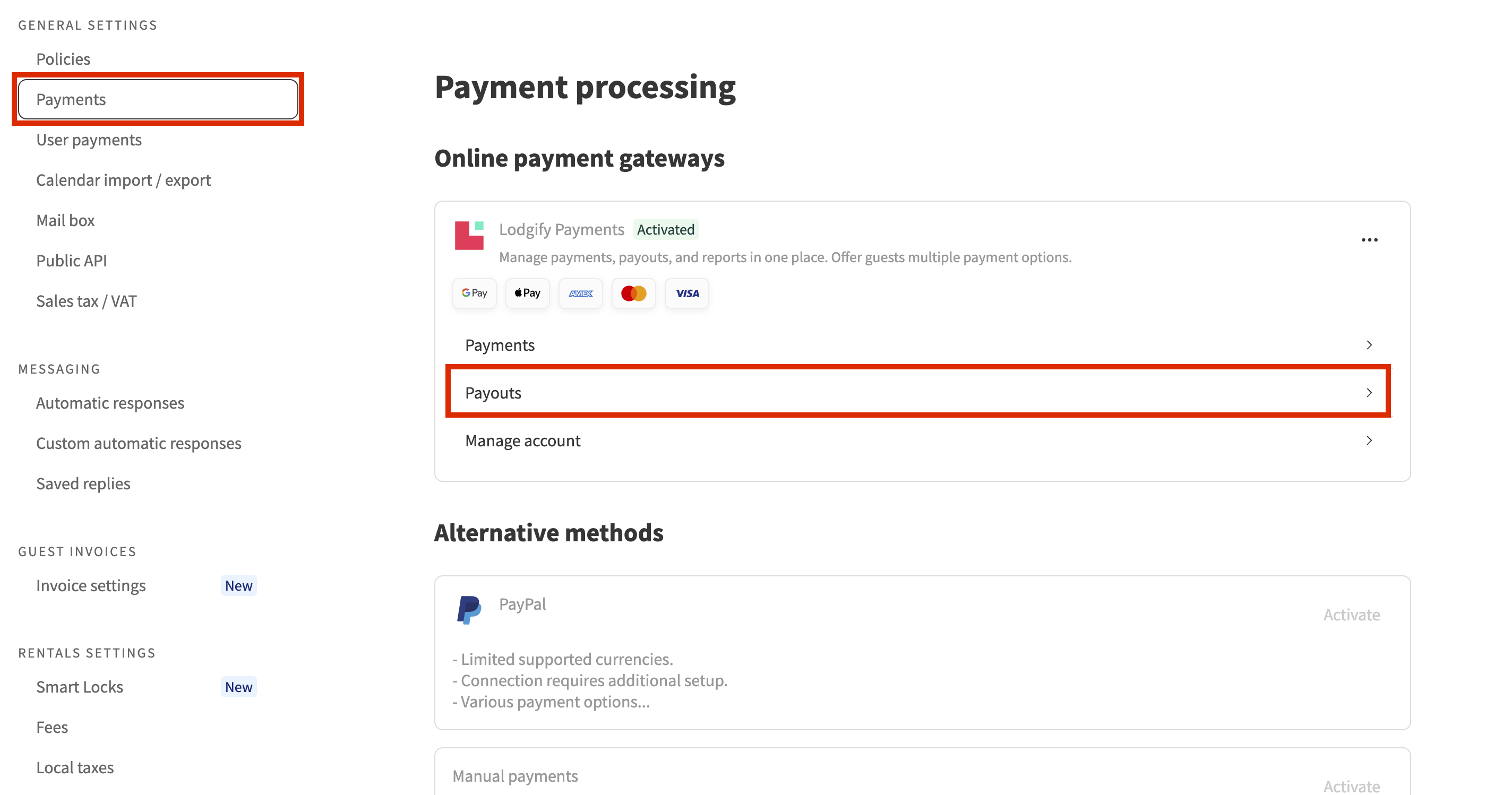 In order to find all the payouts sent by Lodgify payments, go to the Settings section of your Lodgify account, select Payments and then Payouts: