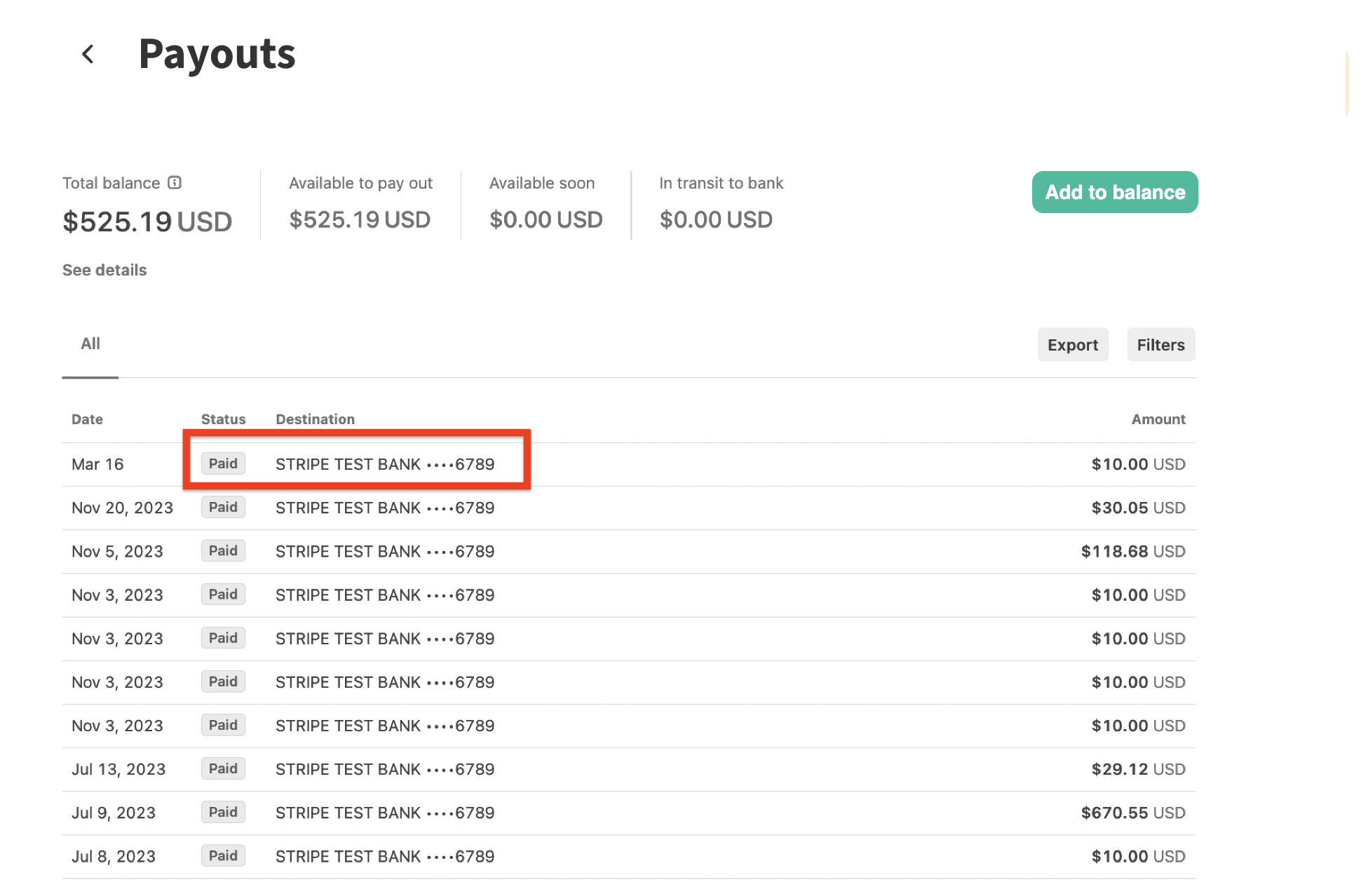 From here, you can view all your payouts and the last four digits of the bank account you added for payouts:
