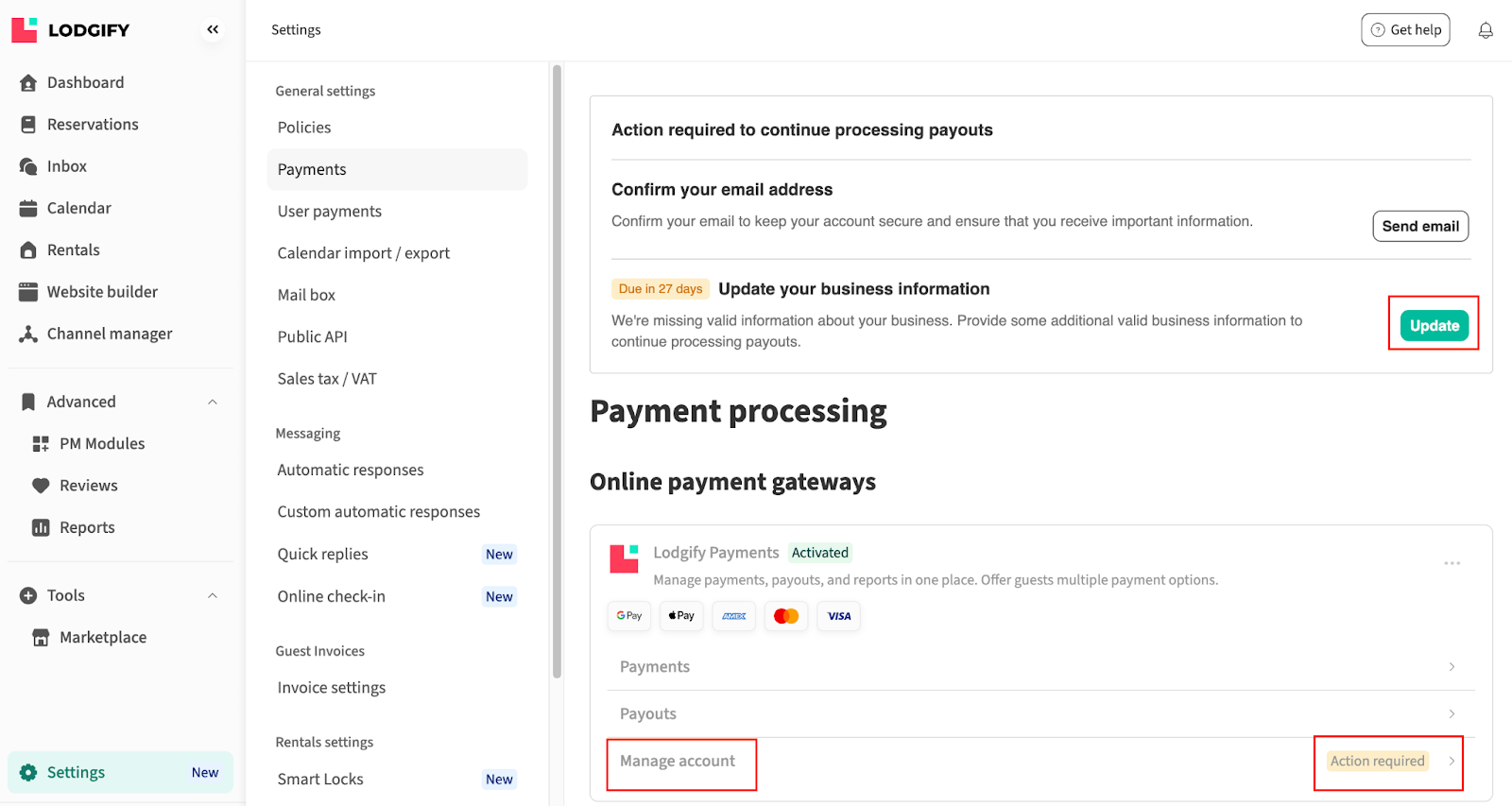 You can provide the required information or documents in your account under Settings and Payments, or you can access it here. To submit the information or documents, select Update or Manage Account.