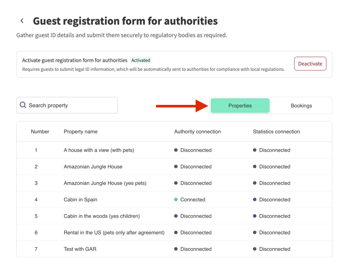 If you’ve just activated Guest Registration, added more rentals, or disconnected and reconnected your account, you will need to establish the connection between your properties and the local authority. To do so, follow these steps: