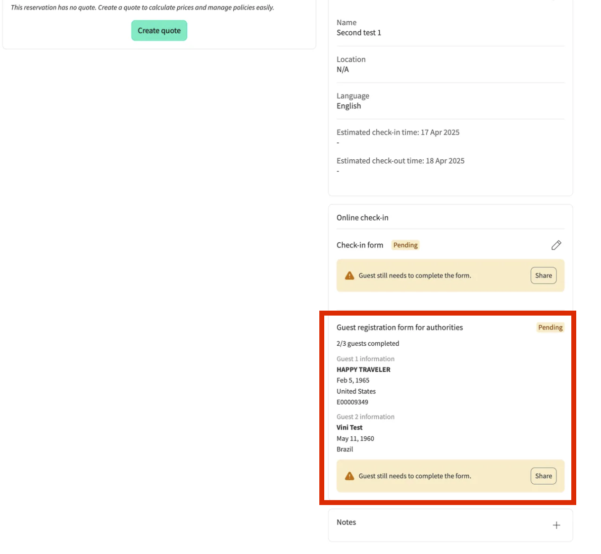 Guest Registration gathers and sends the information required by local authorities, ensuring compliance with regional regulations, whereas the reservation check-in form focuses more on reservation-specific details, such as the guest’s arrival time or custom questions, and does not share any data with local authorities.
