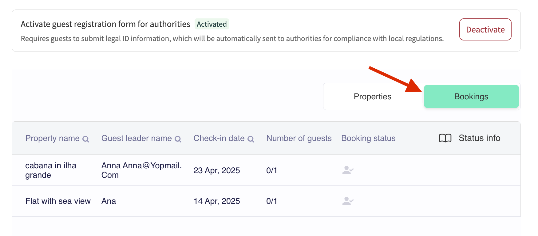 - In the Guest Registration section, the submitted information will appear under the Bookings tab.
