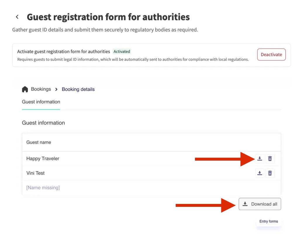 - You can choose to download the information submitted for a specific guest, or for all guests associated with that booking.