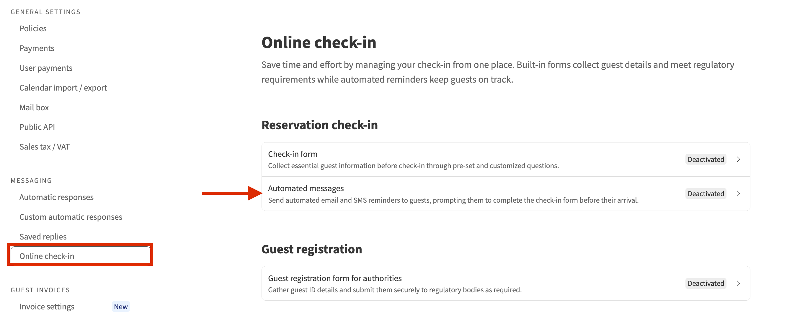 If the reservation check in form is enabled, the registration form will be sent along with it. When enabling the check-in form, you can choose to activate Automated Messages, if you do, the registration form will be sent automatically at the same time as the check-in form, following the sending rules configured in your Automated Messages settings.
