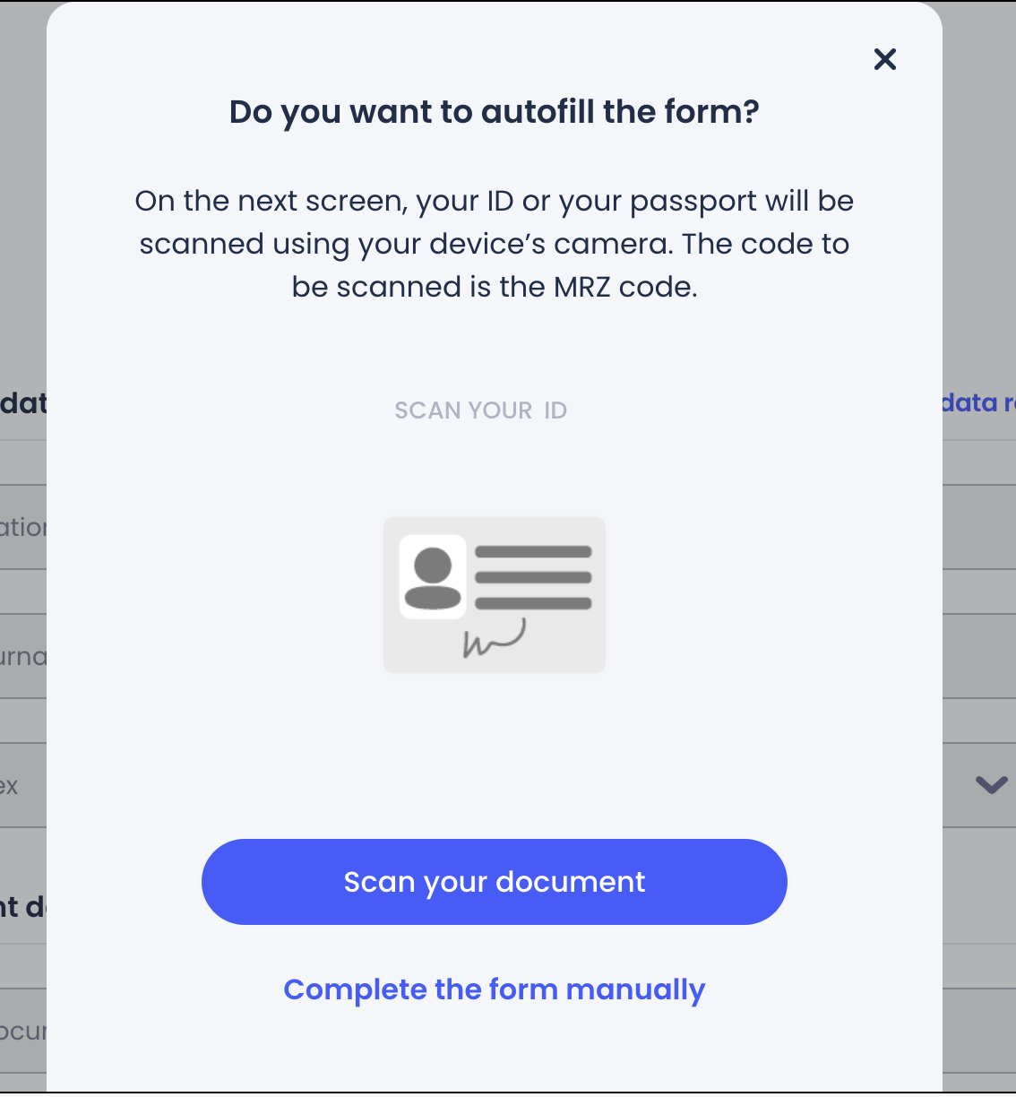 💡 Note: If the reservation check-in form is activated, the guest registration form will automatically follow after the reservation check-in form is completed. - They have two options: they can either add their ID or passport to auto-fill the form, or enter their personal information manually.