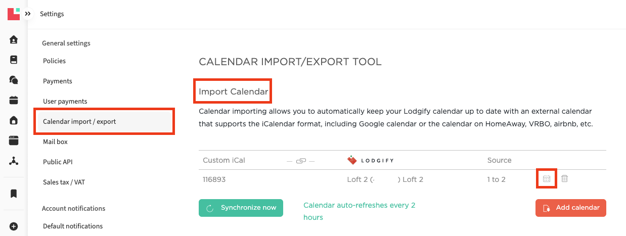 - Go to the Import/Export Calendar section in Lodgify, under Settings.