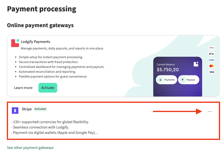 - Click the three dots inside the Stripe section and select Settings.