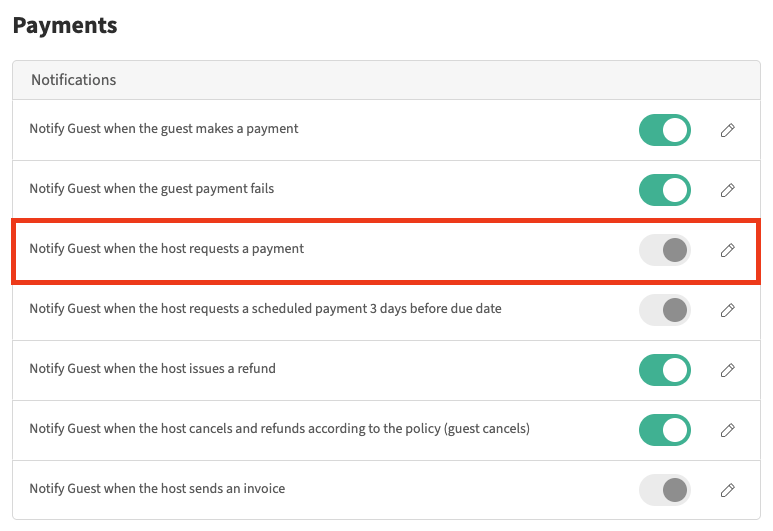 💡 Note: You can edit/review the content of the payment request notification in the Automatic responses section of your account. Click on the pencil icon next to the notification "Notify Guest when the host requests a payment":