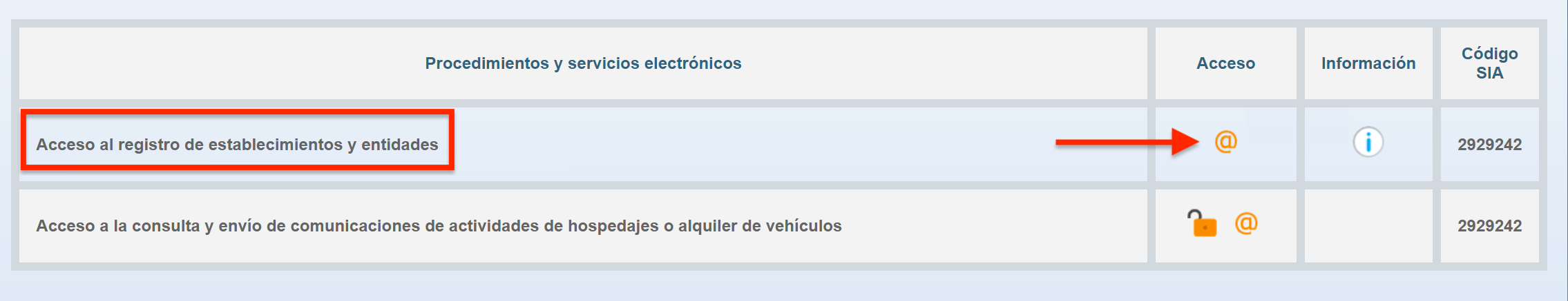 - Log in to the SES Hospedajes page, and in the table, look for "Acceso al registro de establecimiento y entidades". Then, in the Acceso column, click the @ button.