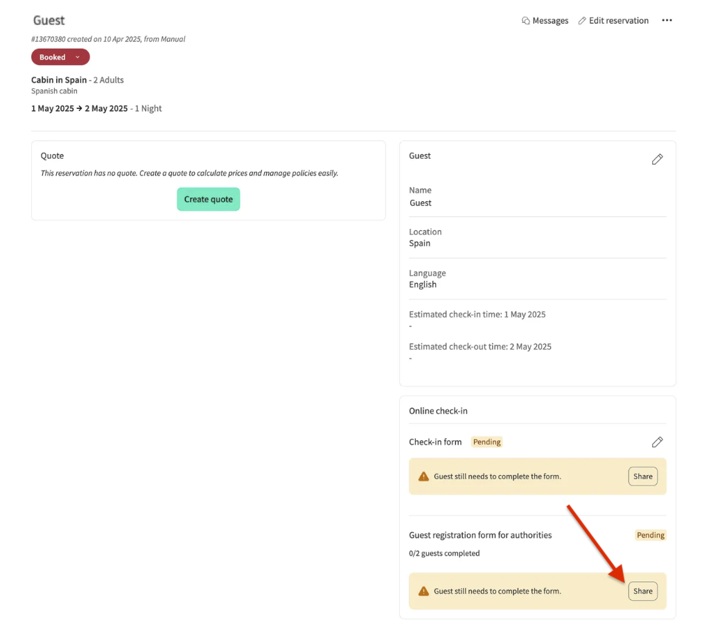 💡 Note: Guest data is automatically sent to the authorities on the day of check-in at approximately 22:00 UTC. If guests register after this time, you will need to send the data manually from the reservation.