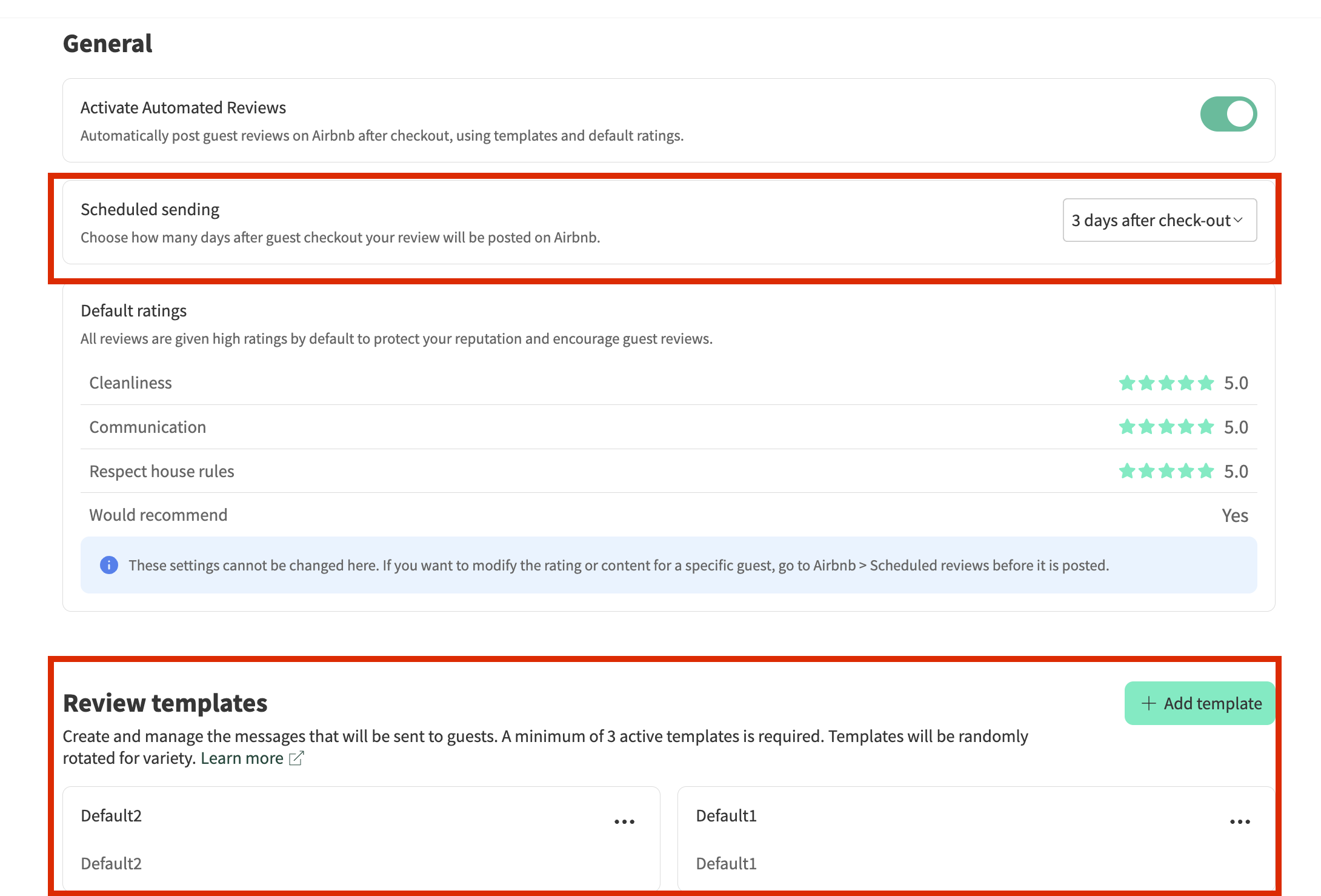 Templates: You can create and edit existing templates that will be used for your automatic reviews. Each time a review is posted, one of your templates will be selected at random. To keep your reviews natural and varied, we recommend creating at least 3 different templates, or more if possible. You can also update them regularly and send some reviews manually from time to time. This helps keep your review history more authentic and engaging for future guests who visit your profile. It also ensures your content stays fresh and diverse, which Airbnb generally values when evaluating listing activity.