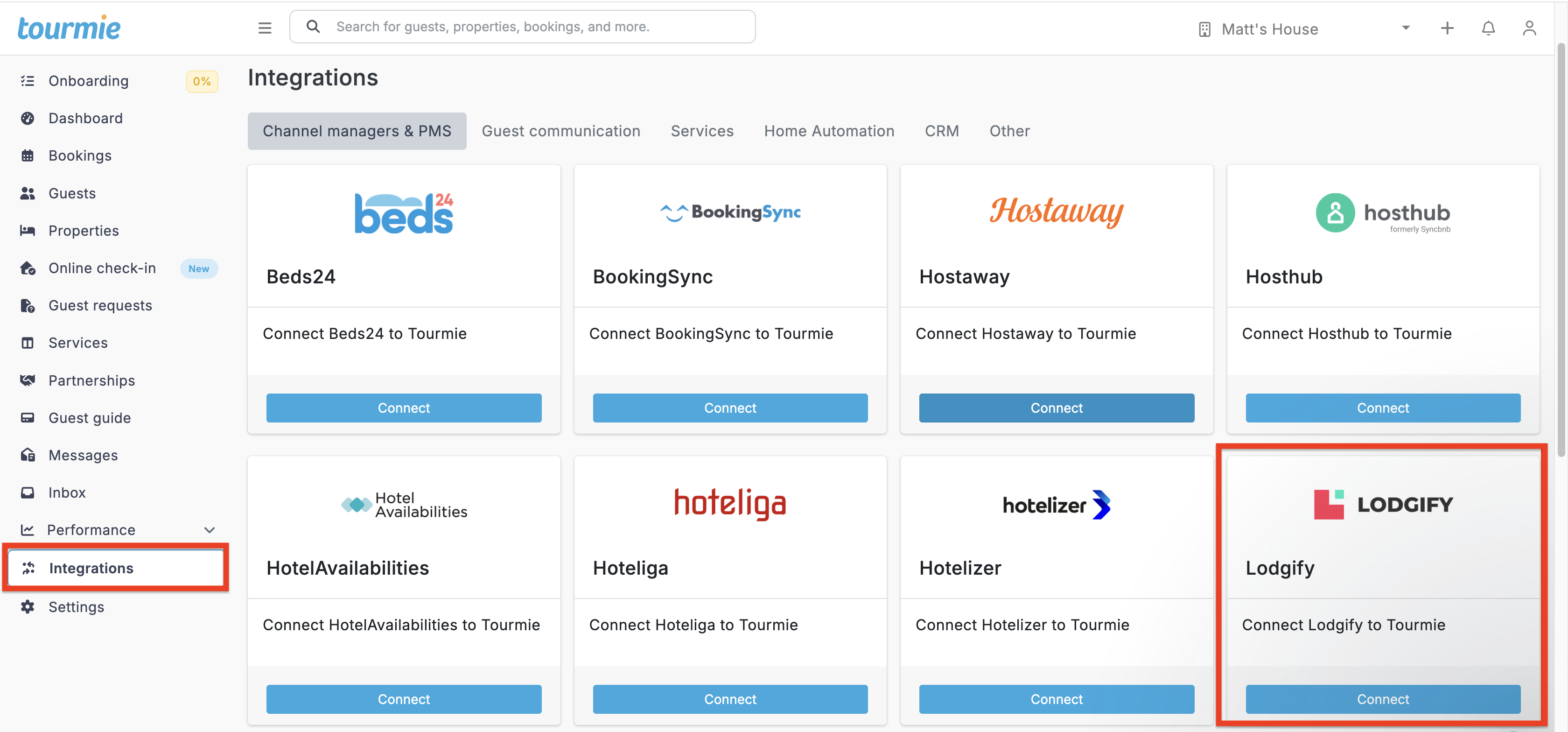 - Then, navigate to the Integrations section and find Lodgify.