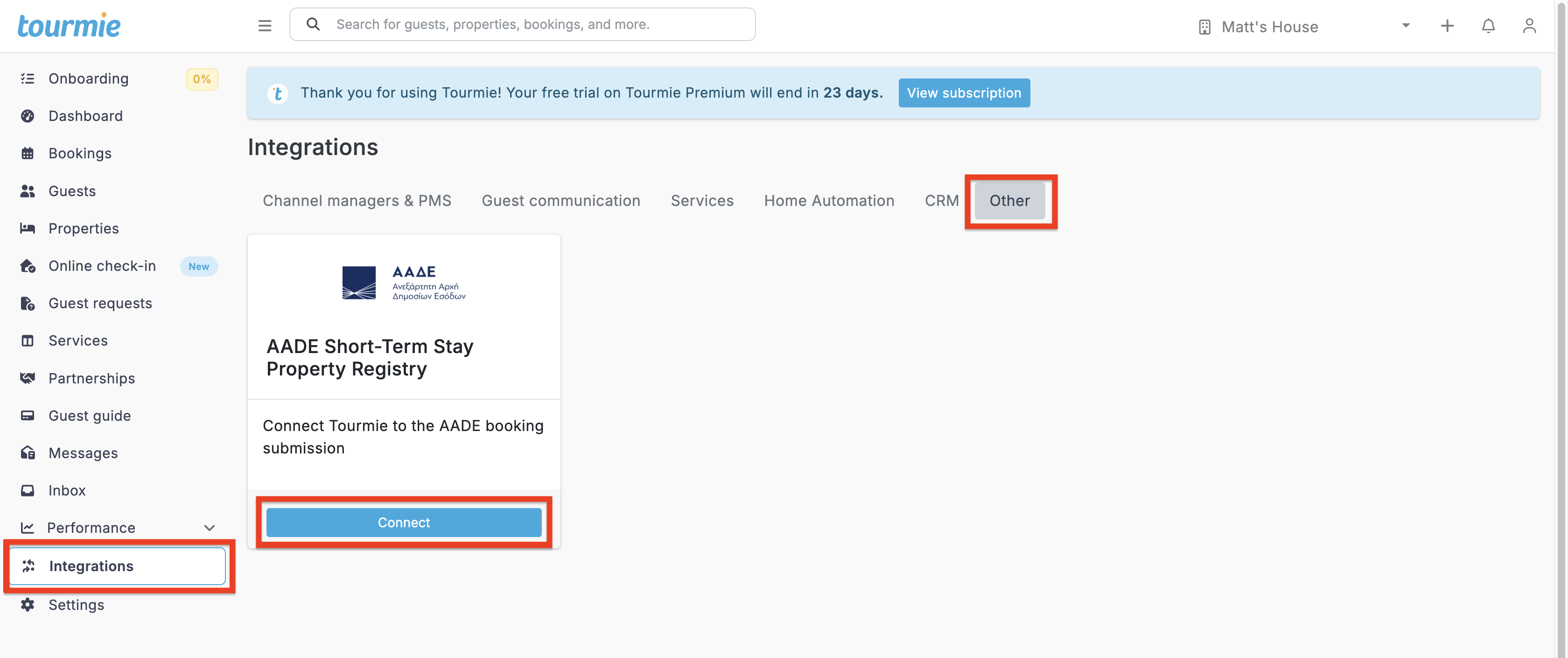 Tourmie integrates with ΑΑΔΕ, the short-term rental registry in Greece, allowing you to submit all bookings and booking values to the government directly through the app.
