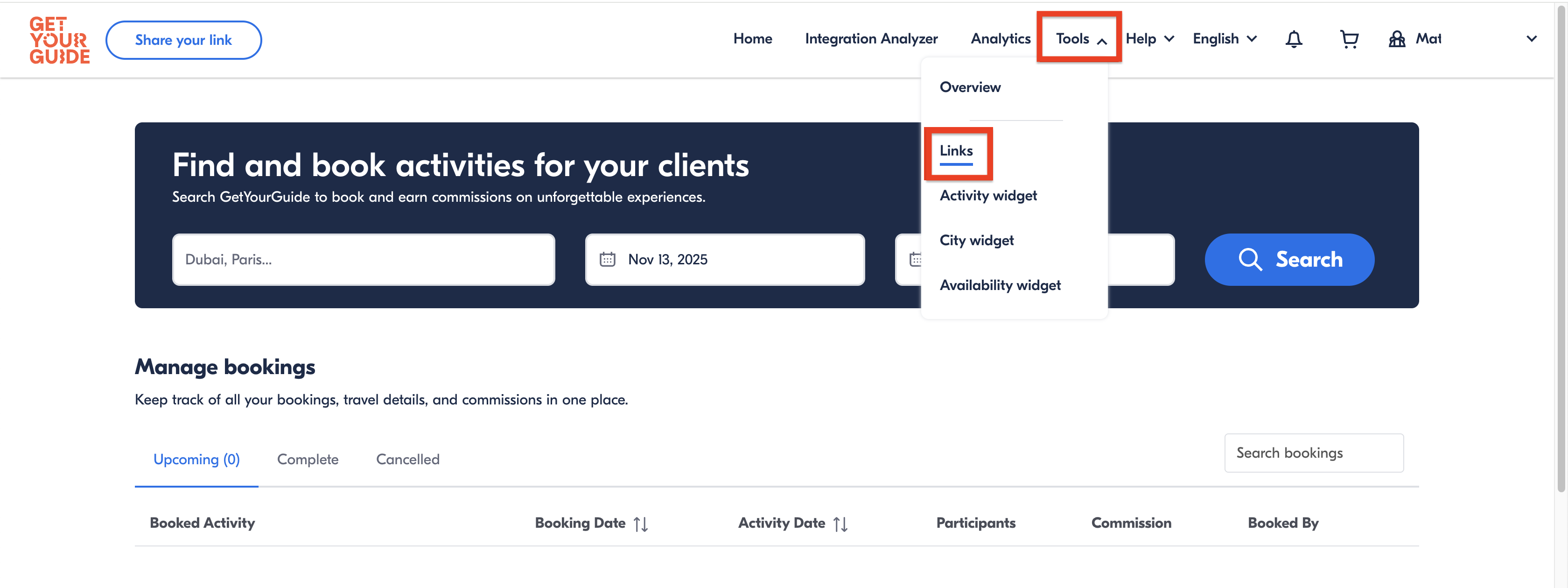 - In your GetYourGuide account, click Tools in the top menu and then Links.