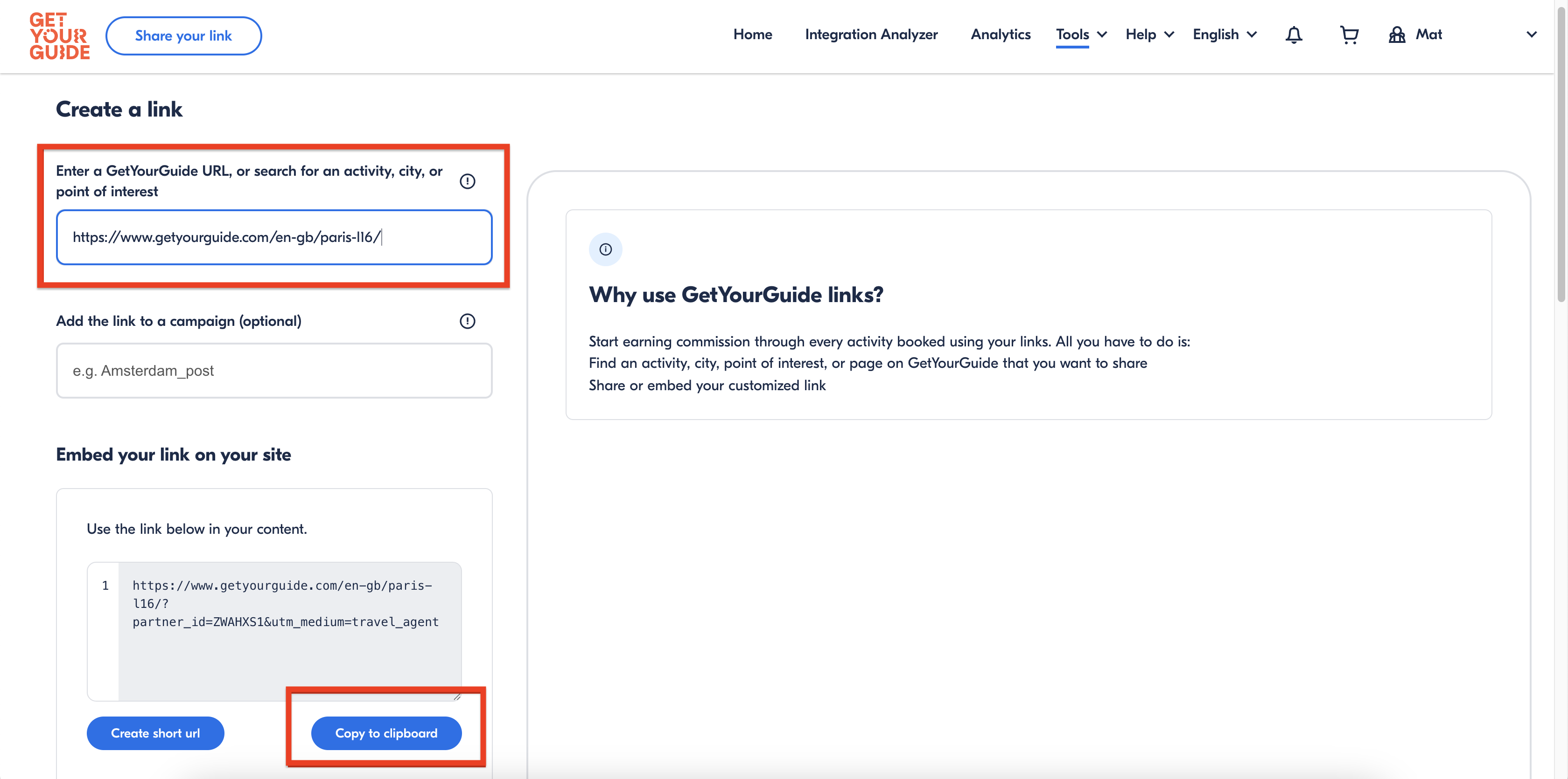 If you want to create a link for a specific city or activity, copy the link from the GetYourGuide website and paste it into the Create a Link section. This will generate a trackable link that you can add to your messages.