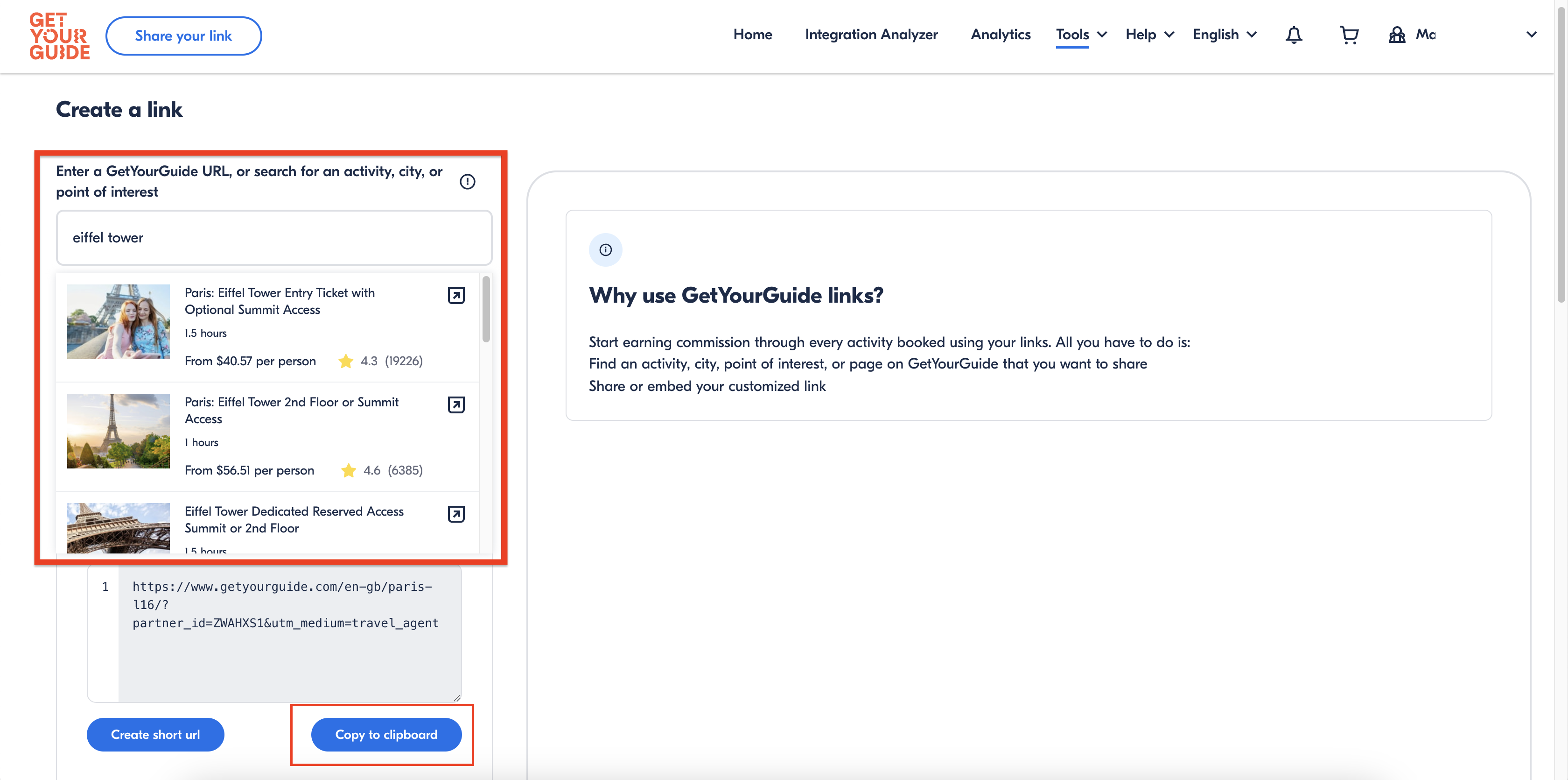 - You can also search for a specific attraction or activity within GetYourGuide and generate a trackable link based on your search.