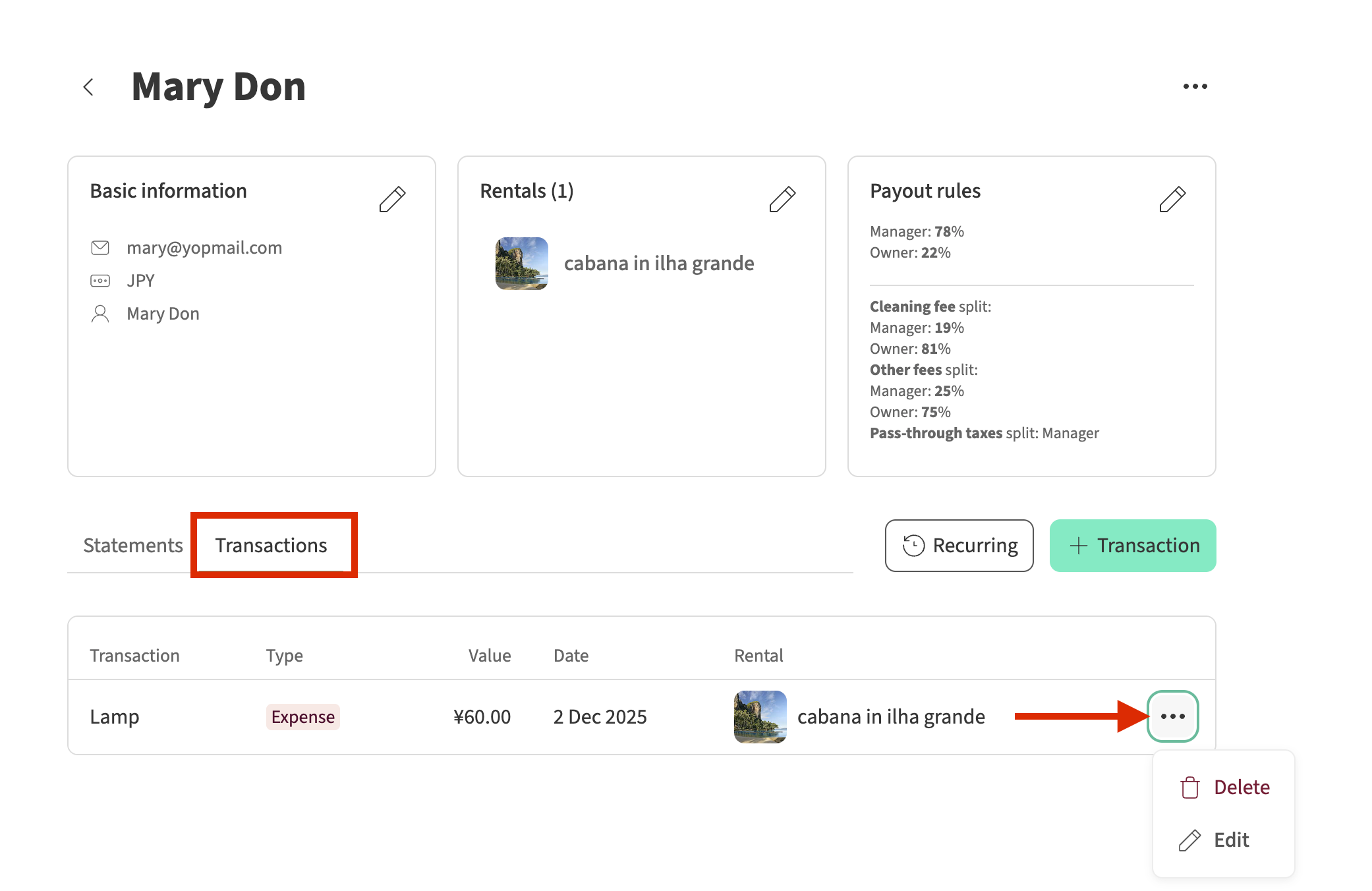 Click the owner whose transaction you want to edit or remove, select Transaction and then click the three dots on the right and select Edit or Delete.