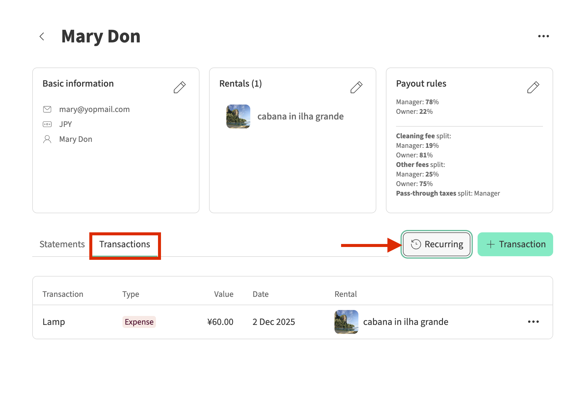 - Click the owner whose recurring transaction you want to manage, then select Transactions and Recurring.