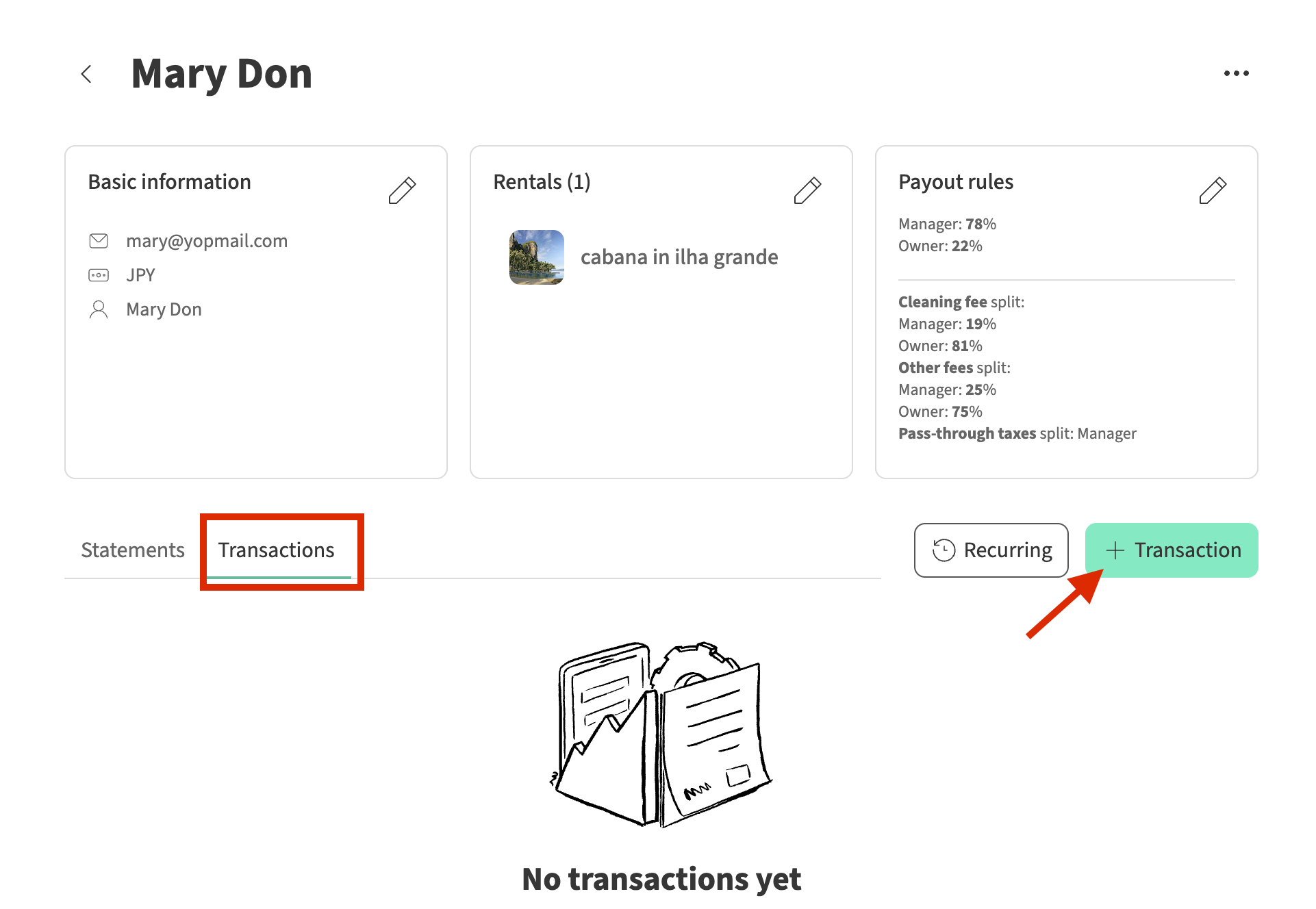 Click the owner for whom you want to create a new transaction, then select Transactions and + Transaction.
