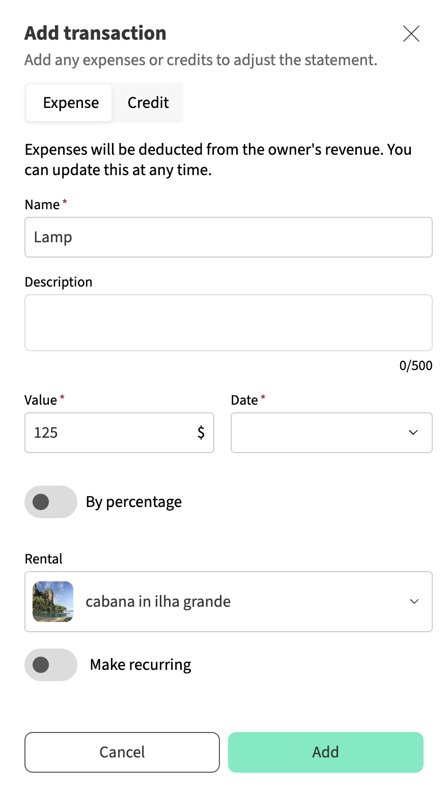 - Fill in the transaction’s name, description, amount, and the date you bought the lamp.