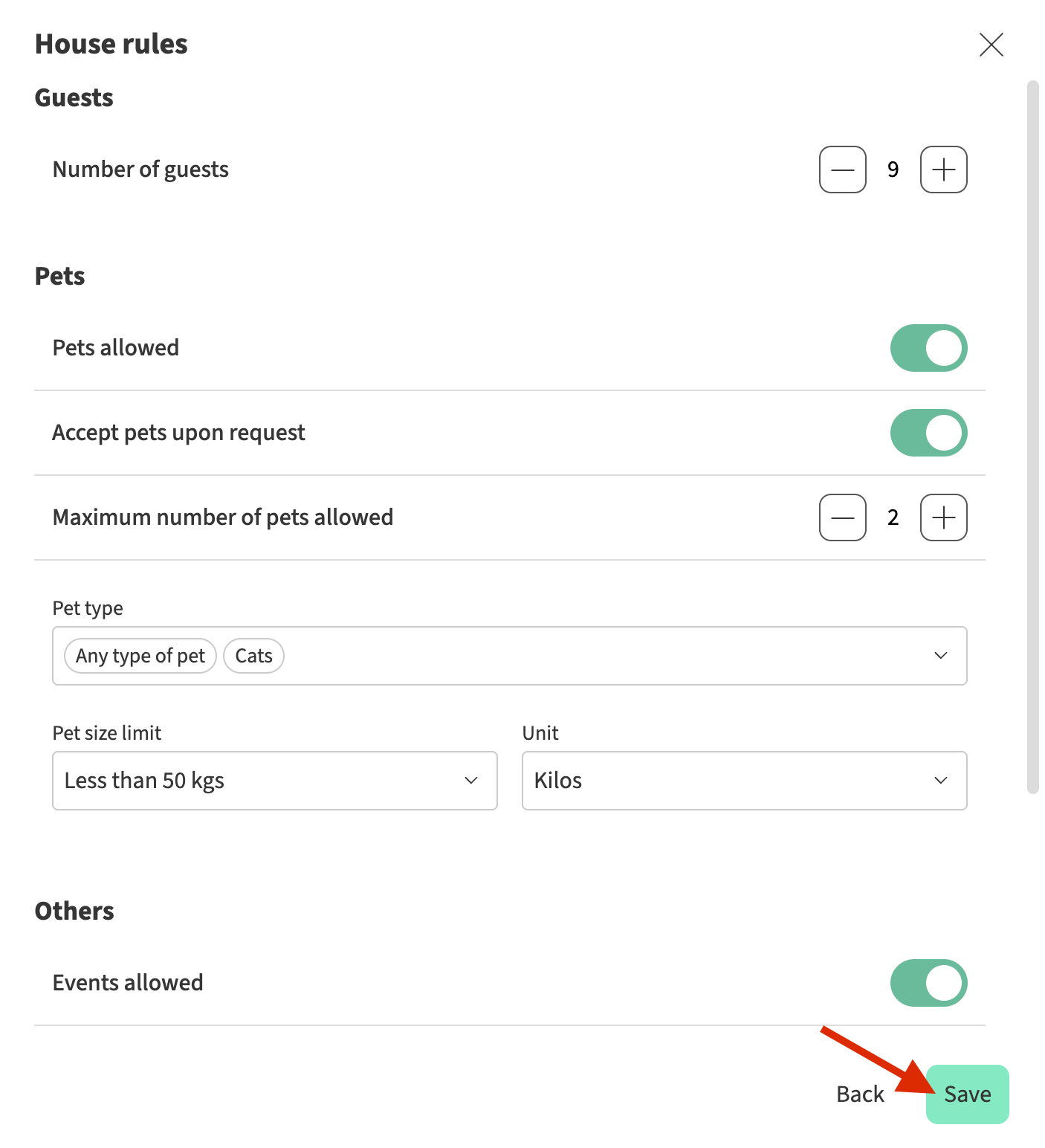 | House rules | Manage the rules guests must follow during their stay, including guest limits, pet policies, event permissions, smoking rules, and quiet hours. |