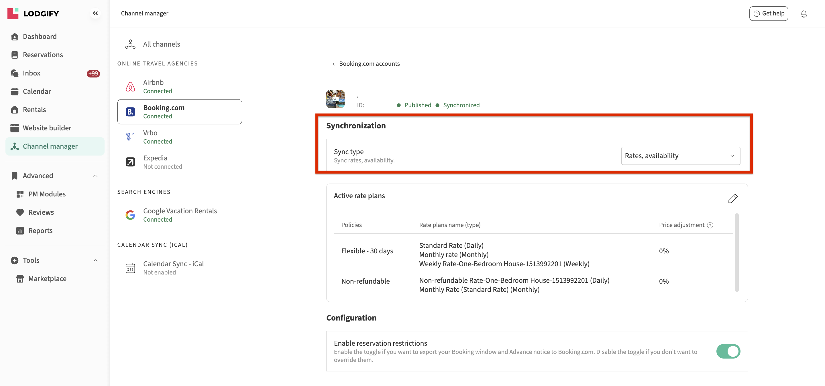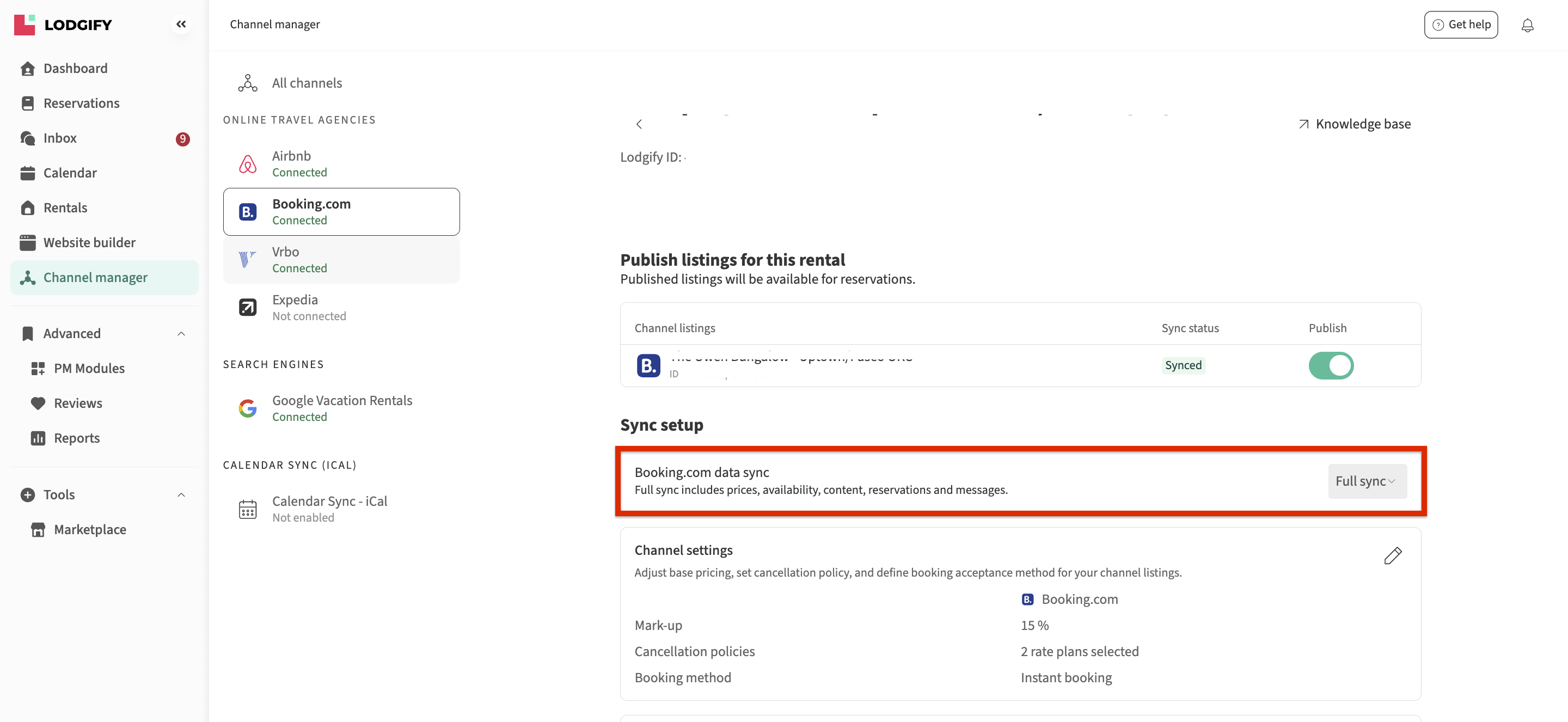 - Full sync: synchronizes all the content from your Lodgify rental with your Booking.com listing.