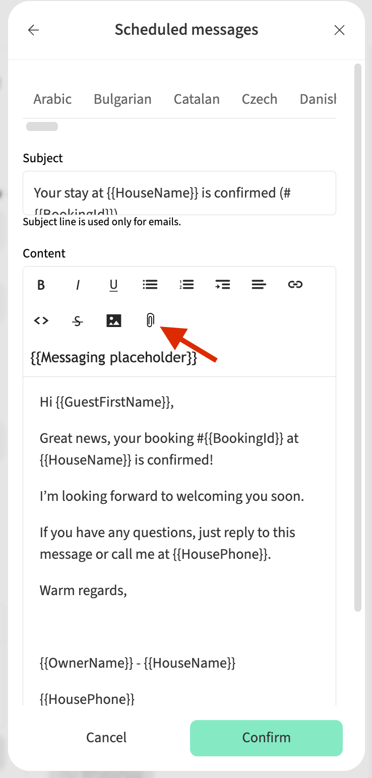 To attach files to messages that are sent by the reservation system when a specific action is triggered in a booking, you need to follow these steps: