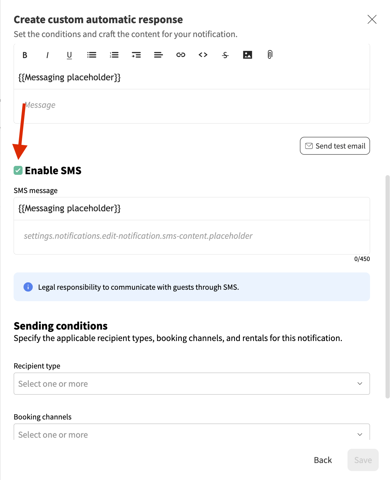 - Create the message content using the rich text editor where you can insert pictures, hyperlinks, etc.. Here you can also use {{Messaging placeholders}} to insert booking/rental-specific information.