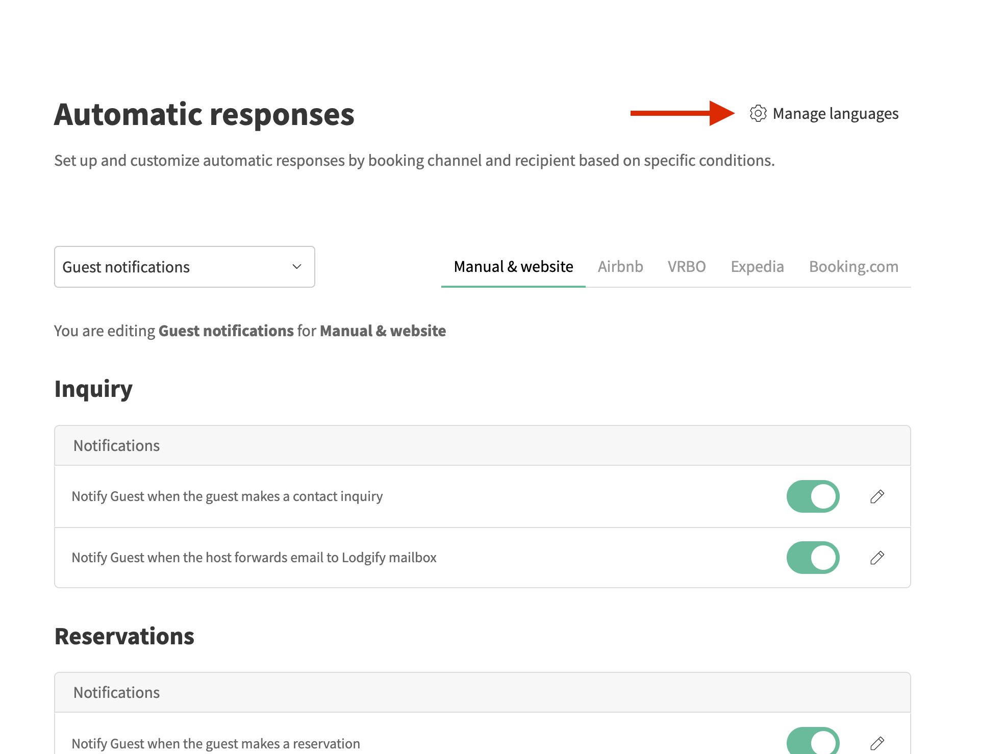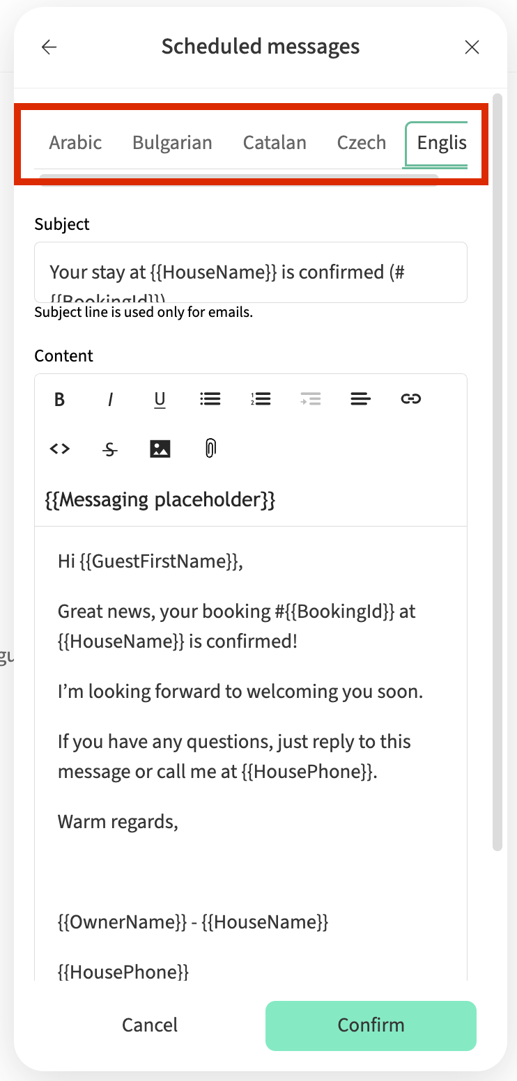 If your website supports multiple languages, it’s important to create scheduled messages and quick replies for each language you offer. This ensures that guests receive messages in their preferred language whenever possible.