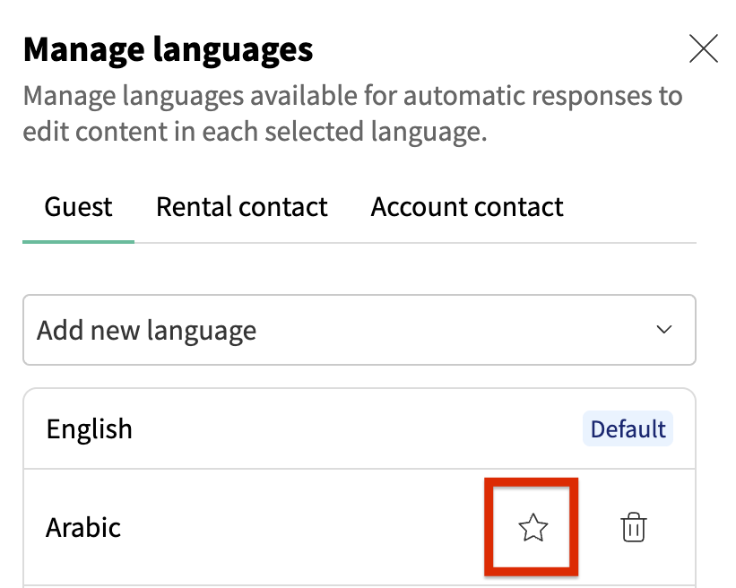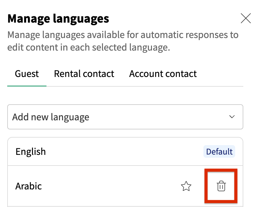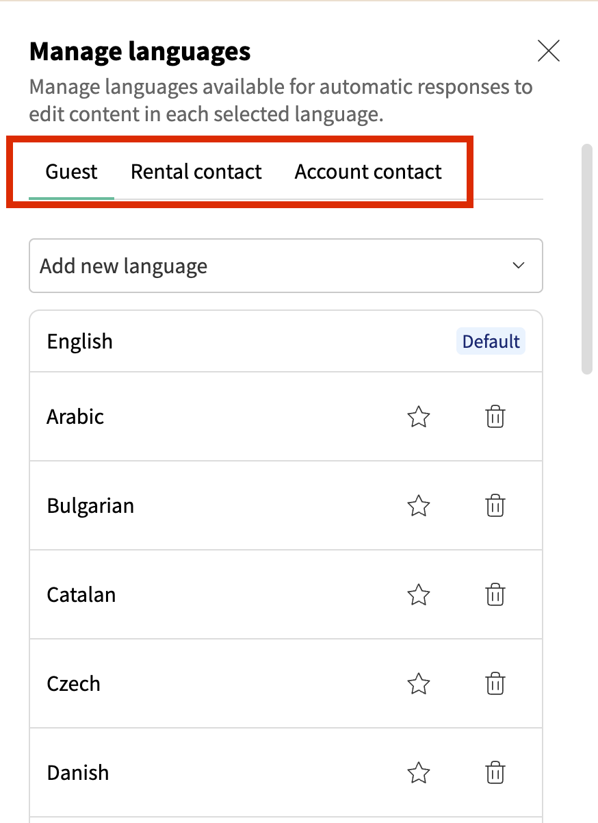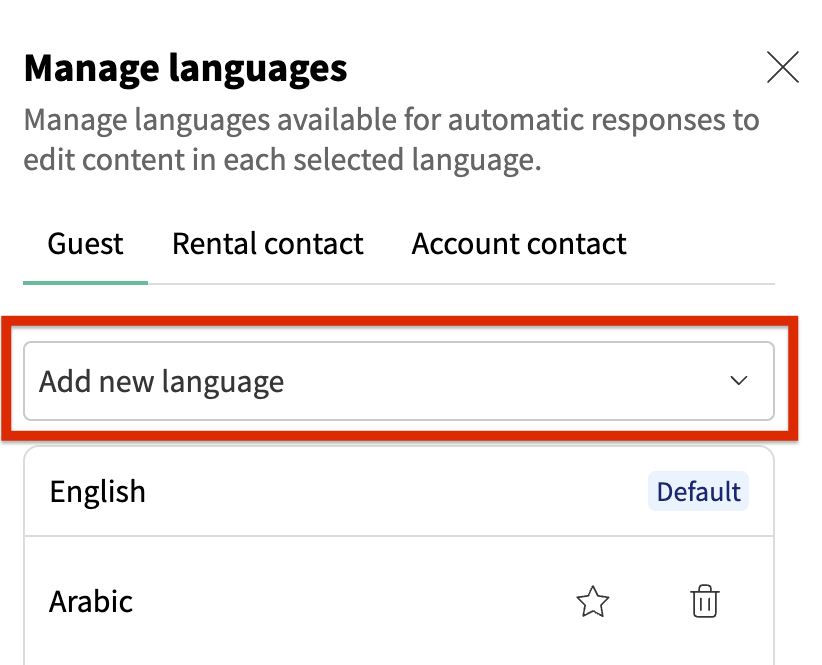 For guests, you can add, remove, and set a default language for messages: