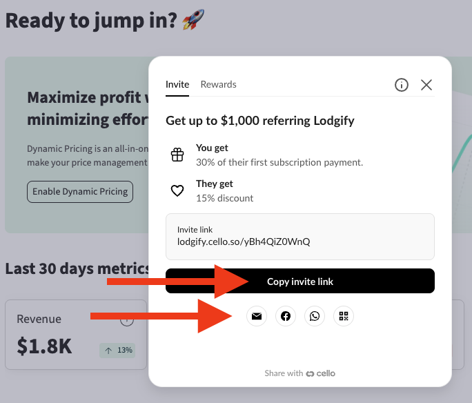 As a Lodgify customer, you can easily invite friends to use Lodgify by sharing your personal referral link, whether on social media, by message, or via email.