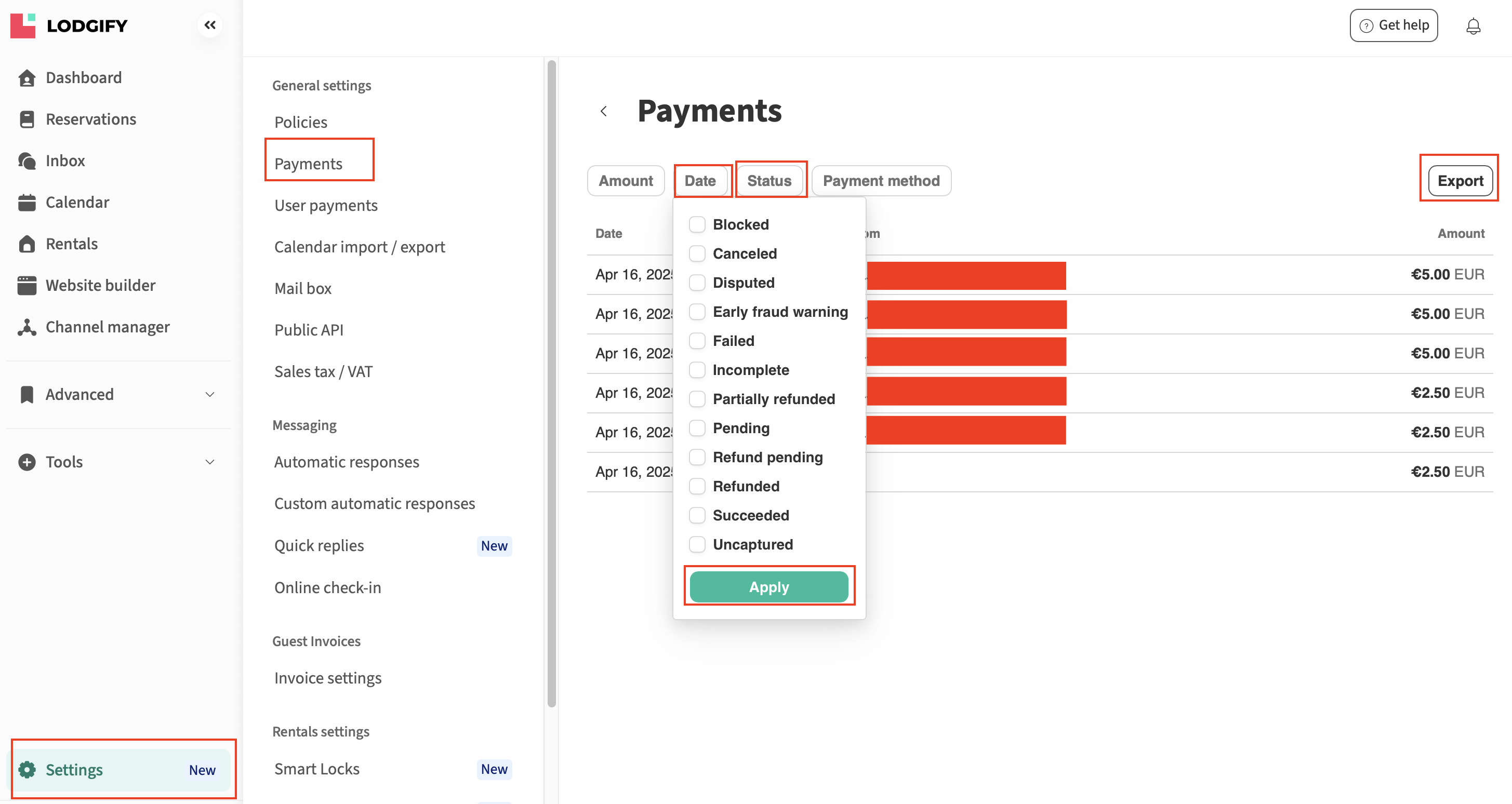 The Lodgify Payments section shows all payments processed through Lodgify Payments, including successful, cancelled, and failed payments.