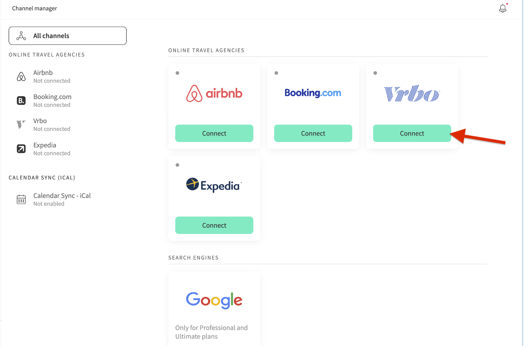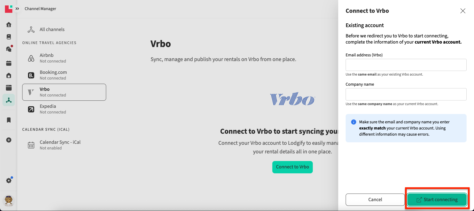 - Go to your Channel Manager section and enter the Vrbo connection.
