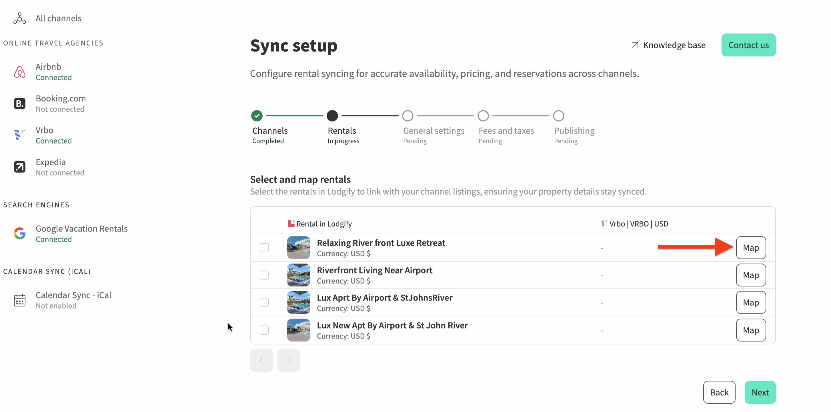 - You’ll see a list of your Lodgify rentals. For each rental you want to connect to Vrbo, click Map: