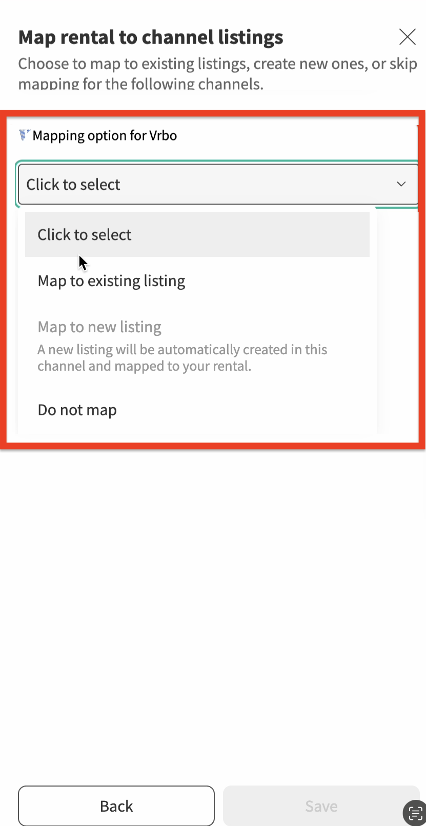 Then, select the correct corresponding Vrbo listing from the dropdown. - Map to new listing: Your rental doesn't exist on Vrbo and you want to list it on Vrbo.