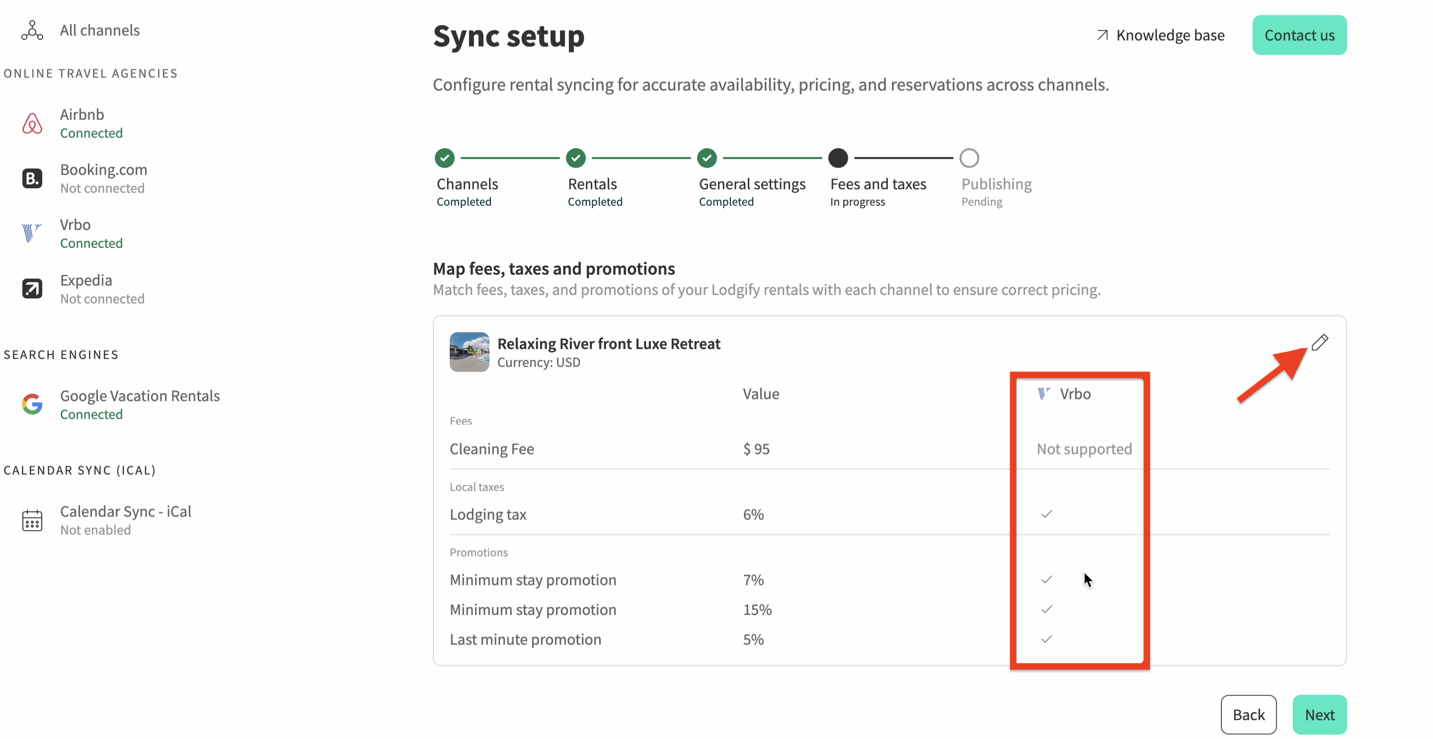 - Then you will be able to review how your Lodgify fees, taxes, and discounts are sent to Vrbo for each rental.