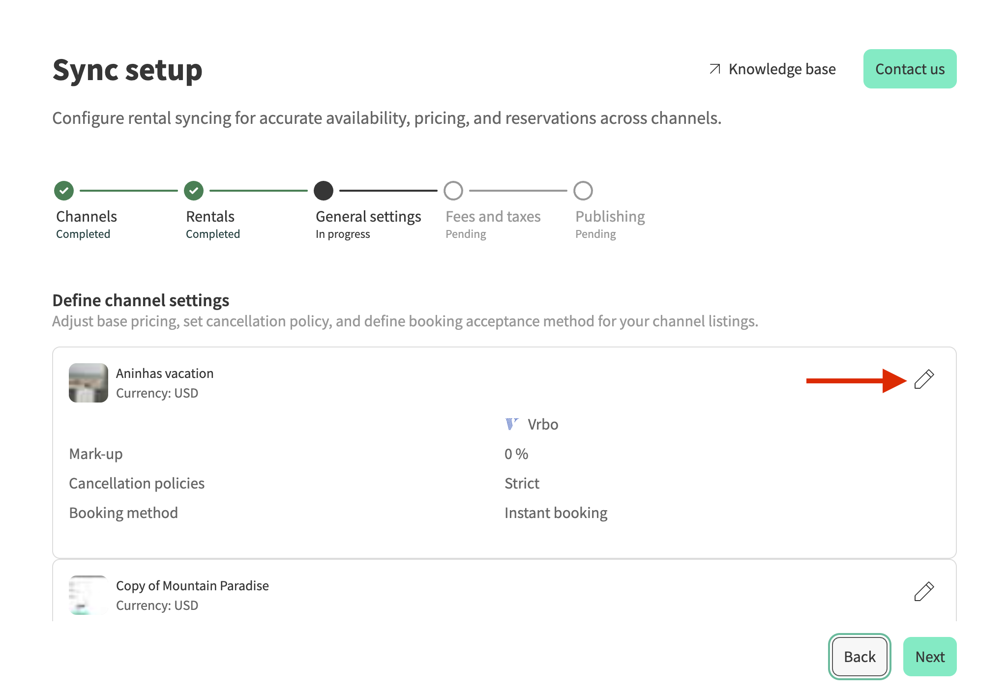 - You can view and edit your Vrbo settings for each rental by clicking the pencil icon, then clicking Next.